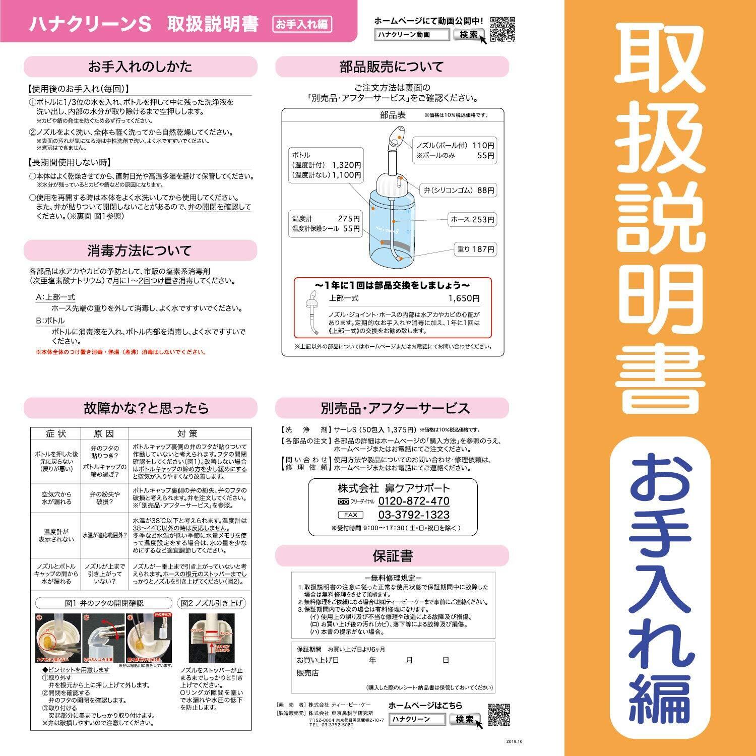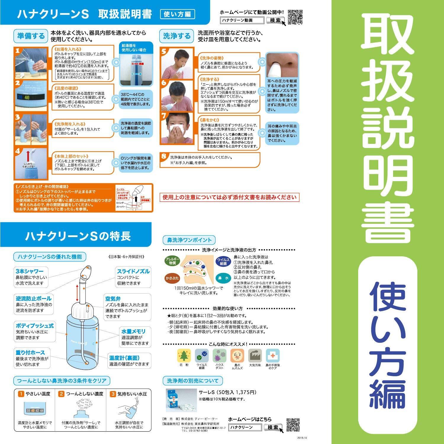 ●鼻洗浄器ハナクリーンS(サーレS10包付)と専用洗浄剤サーレS50包入りのセットになります。 ●ご使用になる前に必ず取扱説明書をお読みください。 (ハナクリーンSの特長) ●1回150mlお手軽洗浄のハンディタイプ。 ●お子さまや携帯用に。 ●片手で簡単ボディプッシュ。 ●スライドノズルで収納便利。 ●つーんとしない鼻洗浄の3条件を調節できるので初めての方でも快適です。 1温度 温度計と水量メモリでやさしい温度 2濃度 洗浄剤サーレで痛くない濃度 3水圧 快適3本シャワーと調節自在な水圧 (使用方法) 1ノズルをしっかり引き上げ、ボトルから上部を外します。 2ボトルに約40℃のお湯を注ぎ、背面の温度計で適温の確認をします。 3専用洗浄剤「サーレS」を1包入れてよく溶かします。 4上部を戻してボトルにしっかり取り付けます。 5洗面所などで前かがみになり、ノズルを軽く鼻にあて「エー」と発声しながら適切な水圧で交互に洗浄します。 6洗浄後はやさしく片方ずつ鼻をかみ、器具はお手入れをしてから保管します。