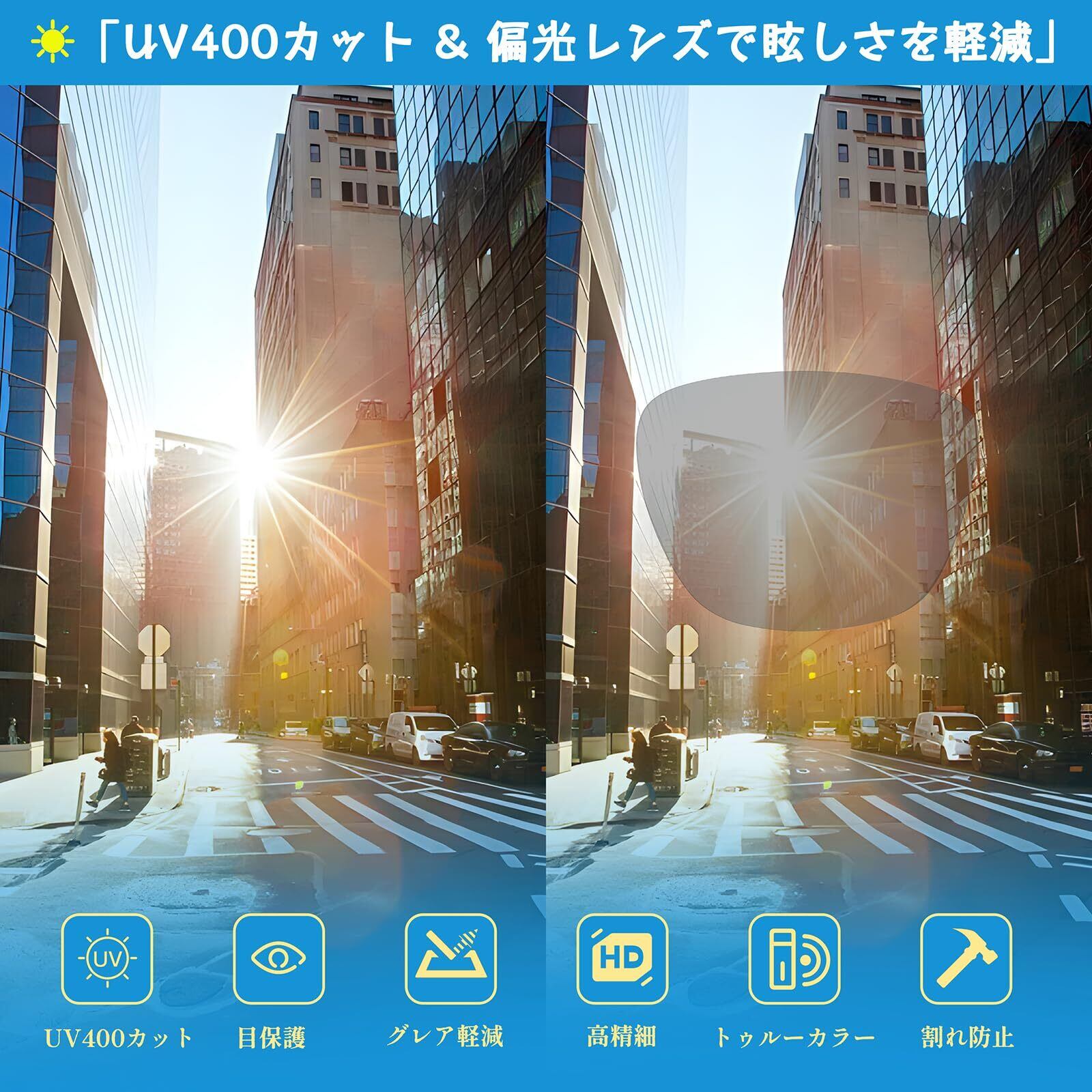 【偏光レンズで反射光をカット】 高性能偏光レンズを採用し、道路や水面などからの反射光を効果的にカット。眩しさを抑え、自然でクリアな視界を提供します。釣り・運転・サイクリングなど、様々なシーンで目の疲れを軽減します。