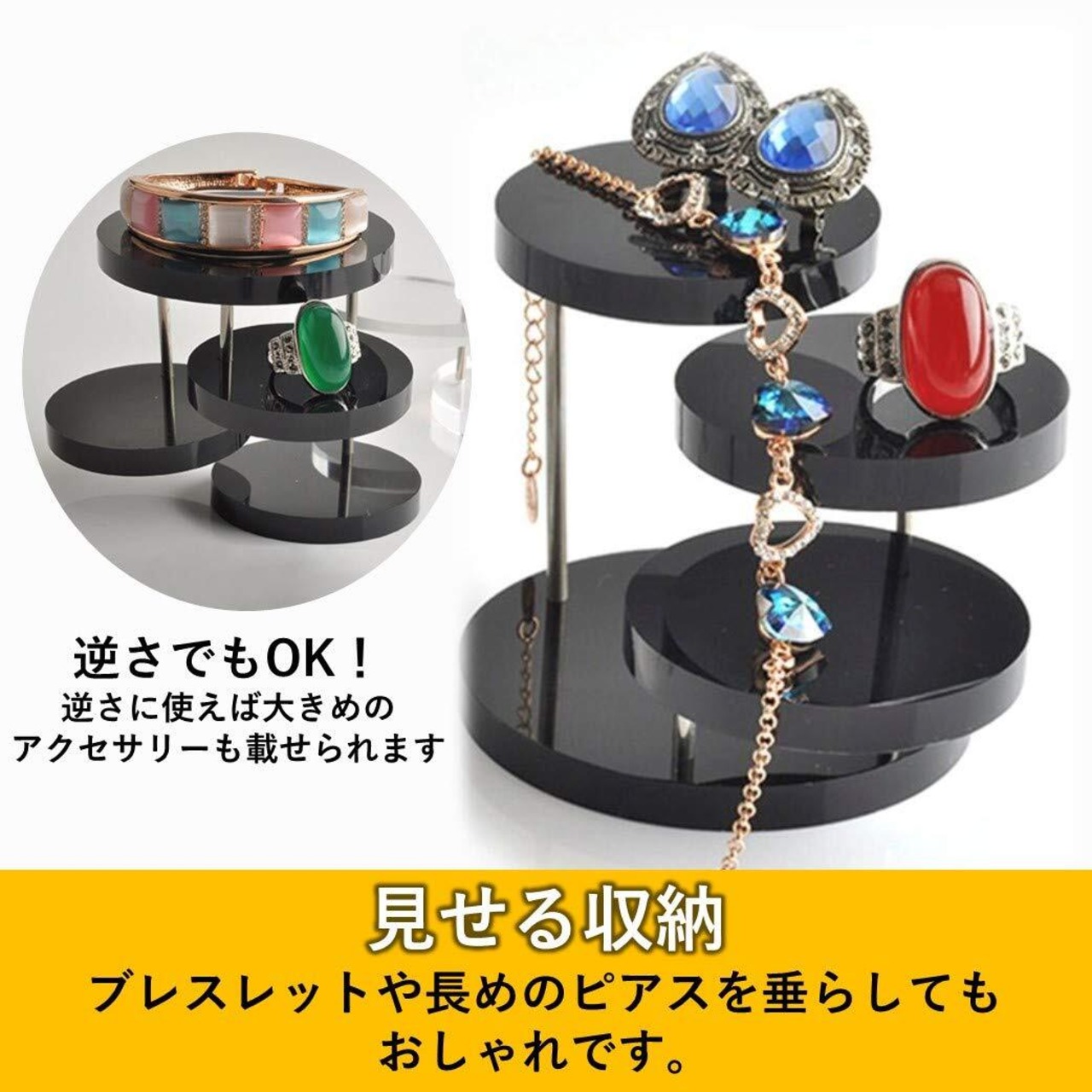 円形の展示台が3段付いたジュエリースタンドです。好きな位置に展示台を移動させて、ジュエリーなどを美しくディスプレイできます。広げてダイナミックに、縮めてコンパクトに、とイメージに合わせて飾ることが可能です。
