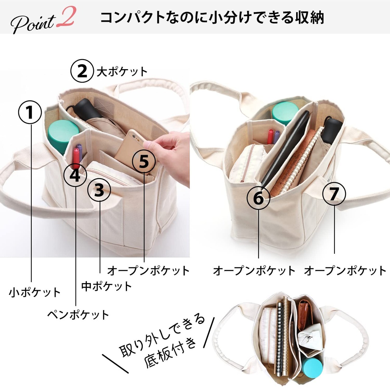 【仕切りがついてすっきり収納】小さめサイズのミニトートバッグに3つ仕切りになった仕切りがつき収納部屋が区分けされスッキリ収納ができます。