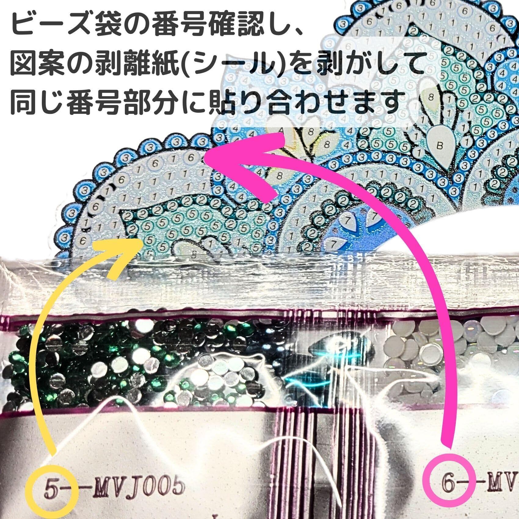 アクリル板の図案には番号がついており、ビーズも色ごとに番号が振られているので、図案の番号と対応する色番号のビーズを、シールを剥がした図案に貼り付けます。