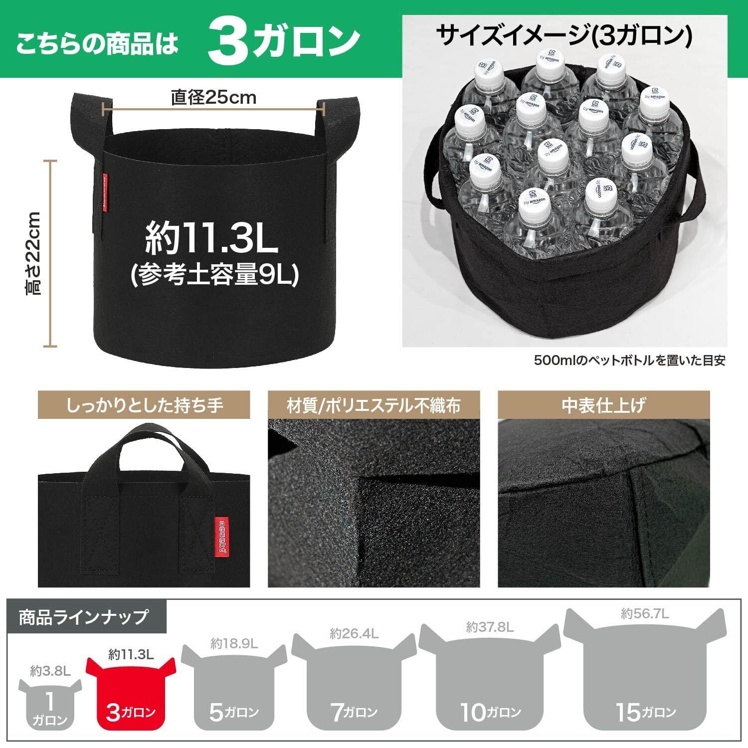 [ネセクト]不織布プランター 根域制限 ベランダ栽培 野菜栽培 果樹苗木 鉢カバー プランターカバー[日本国内企画品] (ブラック6枚, 3ガロン 幅25×高22cm)