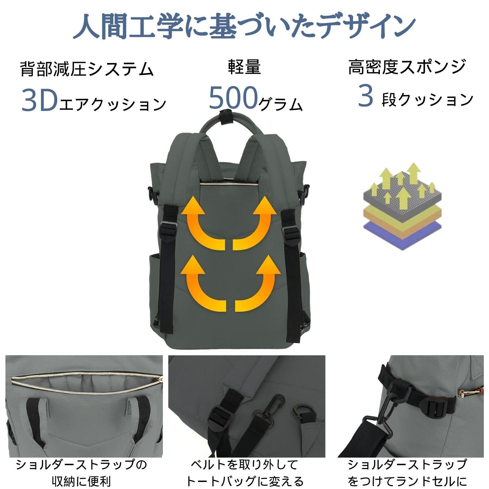 [デザイン]リュック用のベルトは背部ポケットに収納可能で、不使用時もスタイリッシュです。また、ショルダーベルトも取り外し可能で、スタイルに合わせて変更できます。側面のサイトポケットには水筒が収納でき、もし水筒の高さが高すぎなら、上のベルトを利用して水筒を固定しても可能です。背面にはエアクッション層があり、ノートパソコンなどの貴重な荷物が守られ、リュックバッグとして掛けると楽です。それに、ノートPCのポケットにベルクロファスナーが付いてるので、荷物が固定できます。男性だけでなく、女性にも楽に使います。