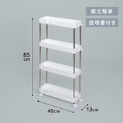 【商品仕様】:サイズ/約幅13×奥行40×高さ85cm(キャスター含む)、カラー/ホワイト、内容/1台、耐荷重/トレイ1枚につき約3kg、材質/ポリプロピレン・ステンレス