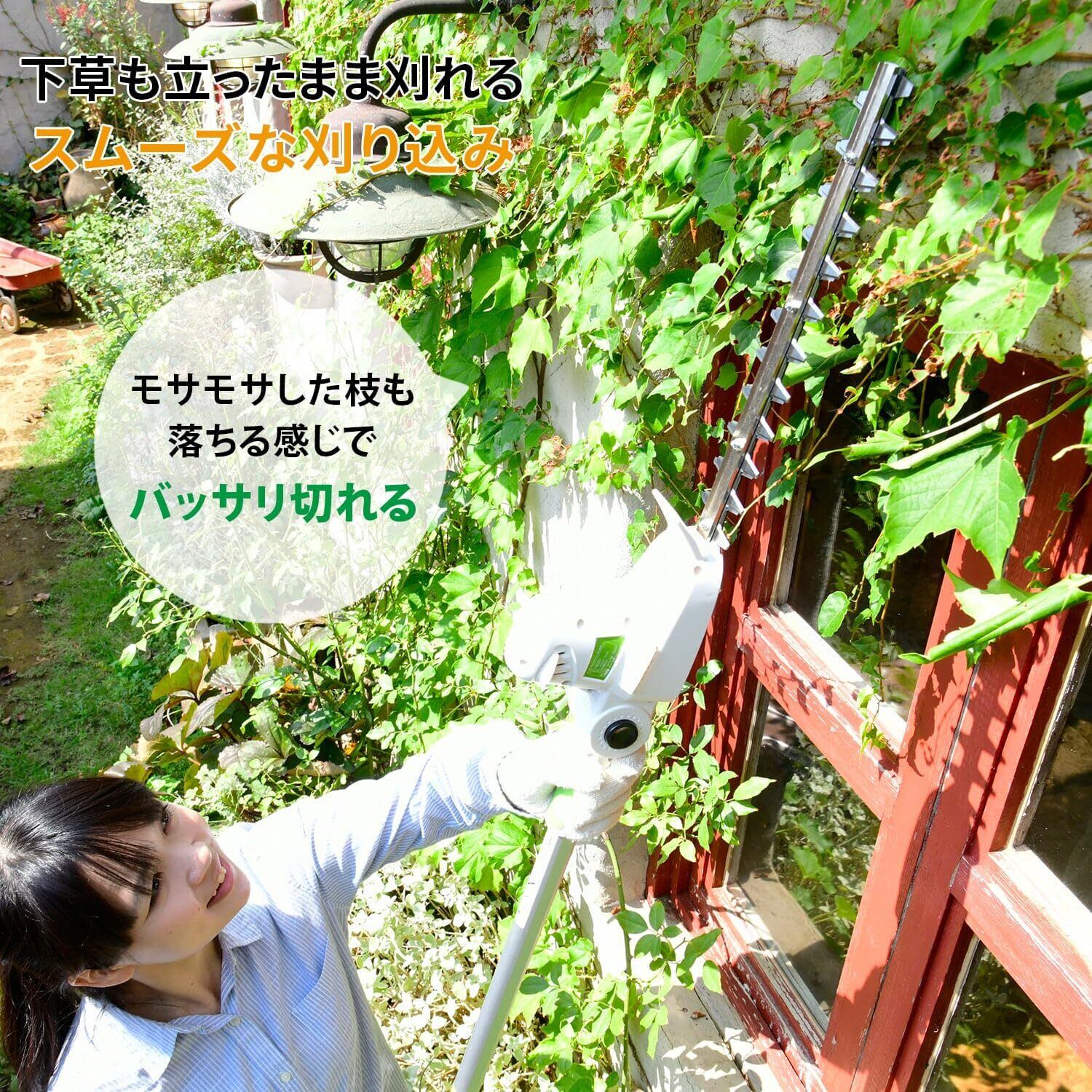 【特徴】電動ガーデントリマーです。刈り込み幅約300㎜の両刃駆動で切れ味抜群です。スムーズな刈り込みを実現しました。伸びきった生垣の剪定に最適です。作業する場所に合わせて、144度(9段階)でヘッジの角度を調節することができます。また着脱式伸縮延長ポールの着脱伸縮によって短縮時約130cmから最長約300cmの高さに合わせることができます。下草も立ったまま刈れるので作業がとても楽ちんです。簡単に着脱できる伸縮ポールだから収納もコンパクトにできます。またお家以外の場所で使う時も持ち運びやすく、ブレードカバーも付いているので安全で便利です。充電切れの心配なしAC電源タイプでパワフルにお使いいただけます。