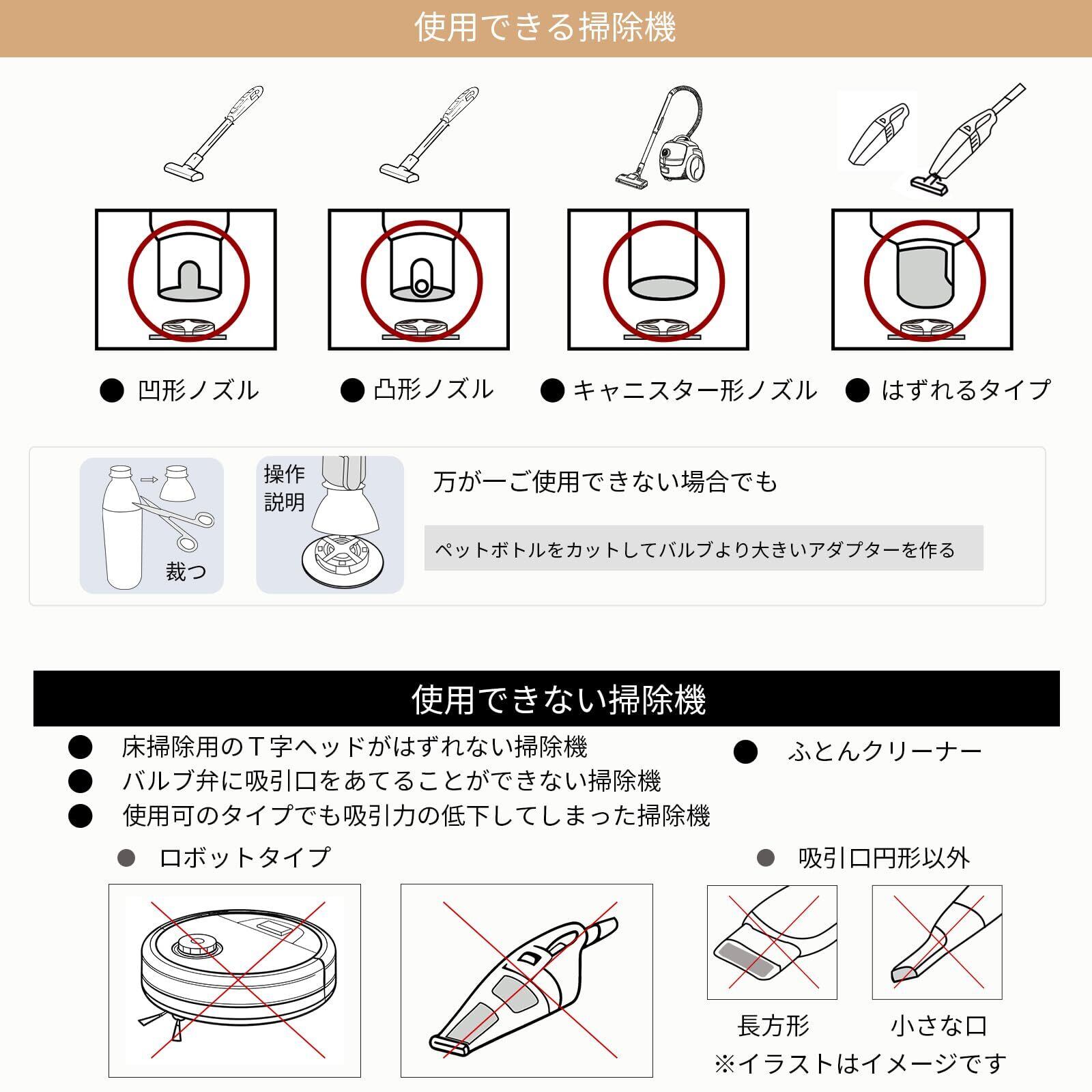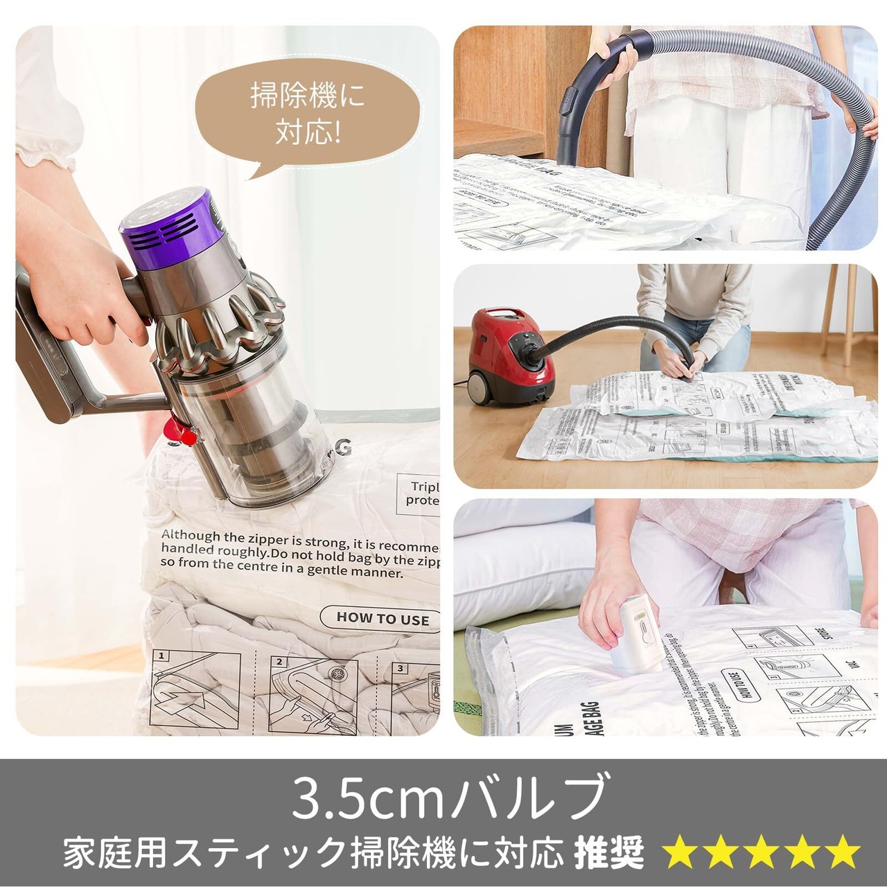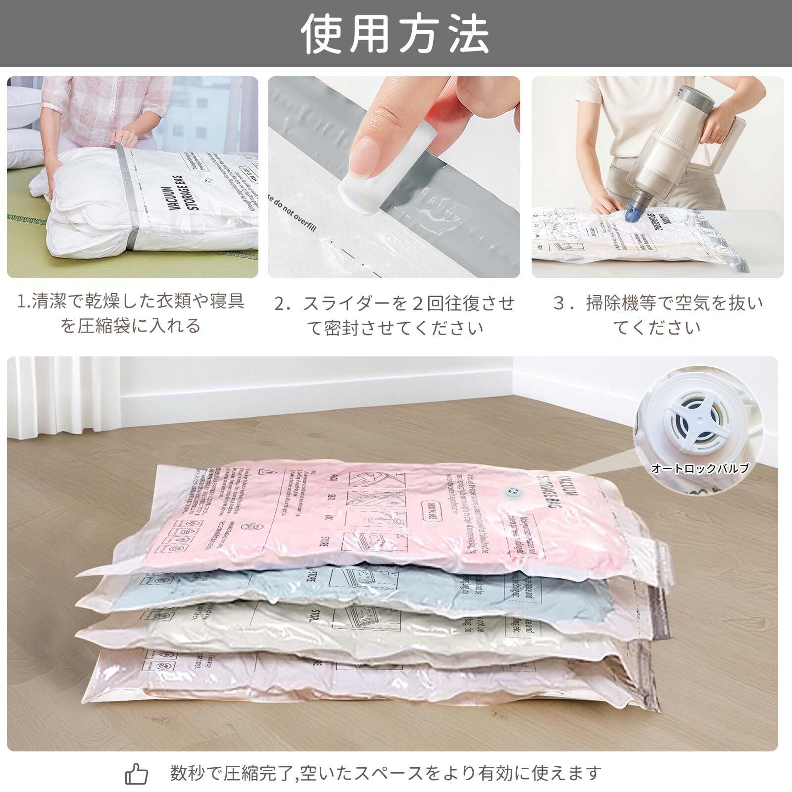 【使い方簡単】大部分の掃除機に対応しています。衣類を収納袋に入れ、ジッパーを閉じた後、空気を吸引するだけです。吸引後は自動的に密閉され、バルブを操作する必要はありません。