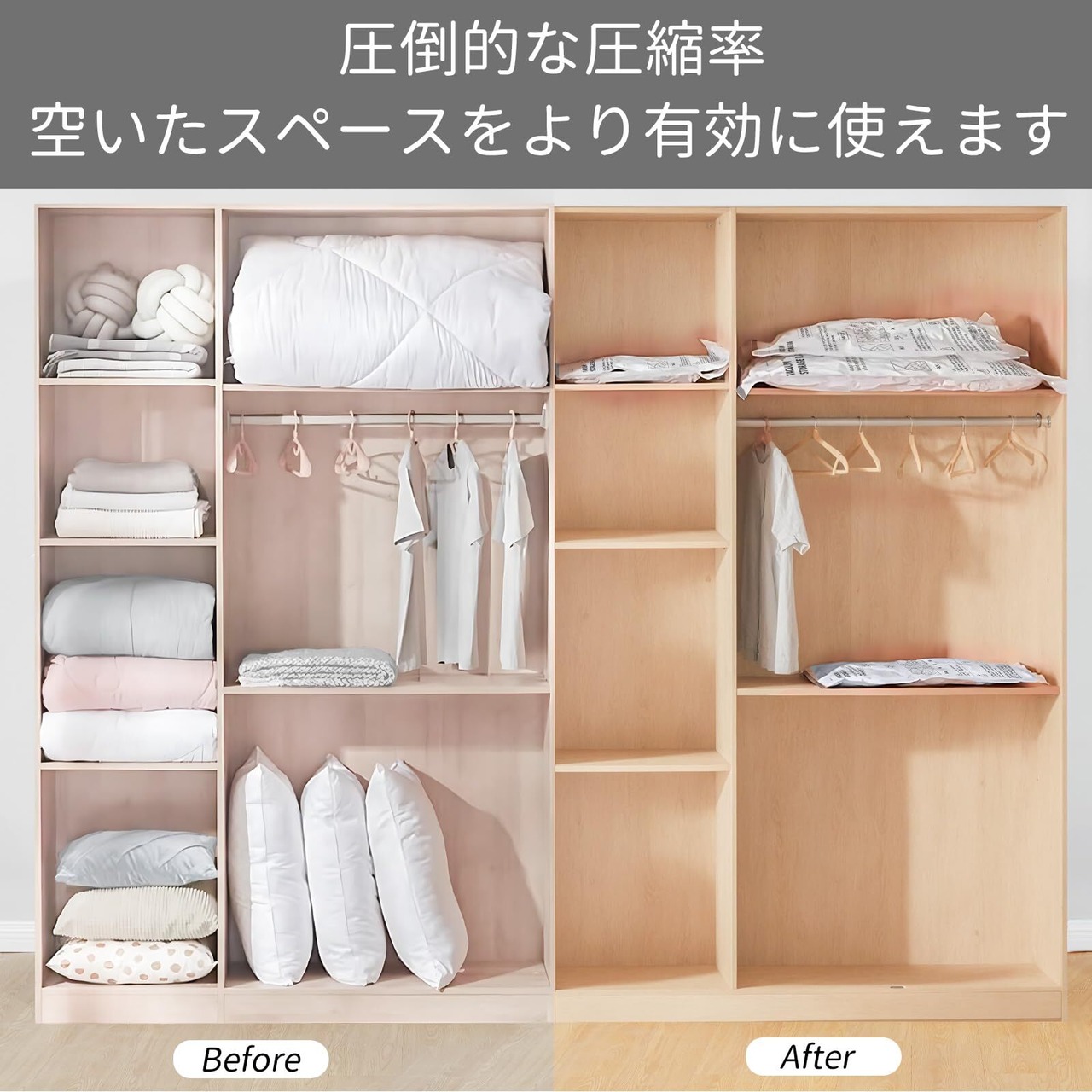 【省スペース】優れた圧縮性能により、布団、毛布、大型ぬいぐるみなどを簡単に収納でき、洋服ワードローブの最大 75%のスペースを節約できます。