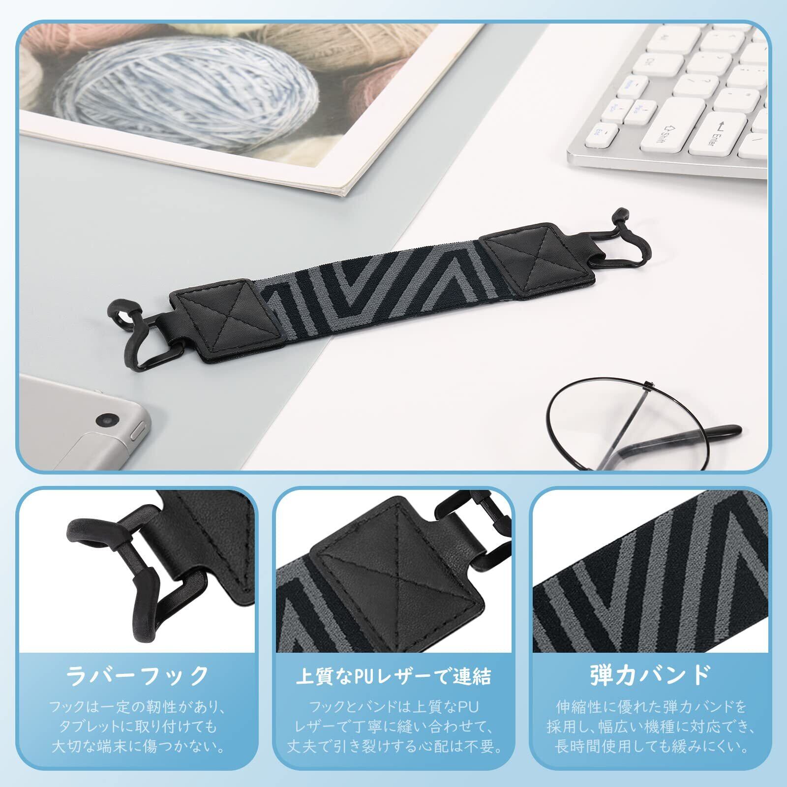 「上質素材採用」 優れた伸縮性がある弾力バンドを採用し、幅広い機種に対応でき、長時間使用しても緩みにくいです。上質なPUレザーを使用してフックの部分と丁寧に縫い合わせて、丈夫で引き裂けする心配は不要です。フックの部分はお客様のご意見を元に改良し、ラバー+シリコンの素材を採用し、タブレットに取り付けても大切な端末に傷つきませんし、滑り止め性能をより一層高め、安心してご利用いただけます。