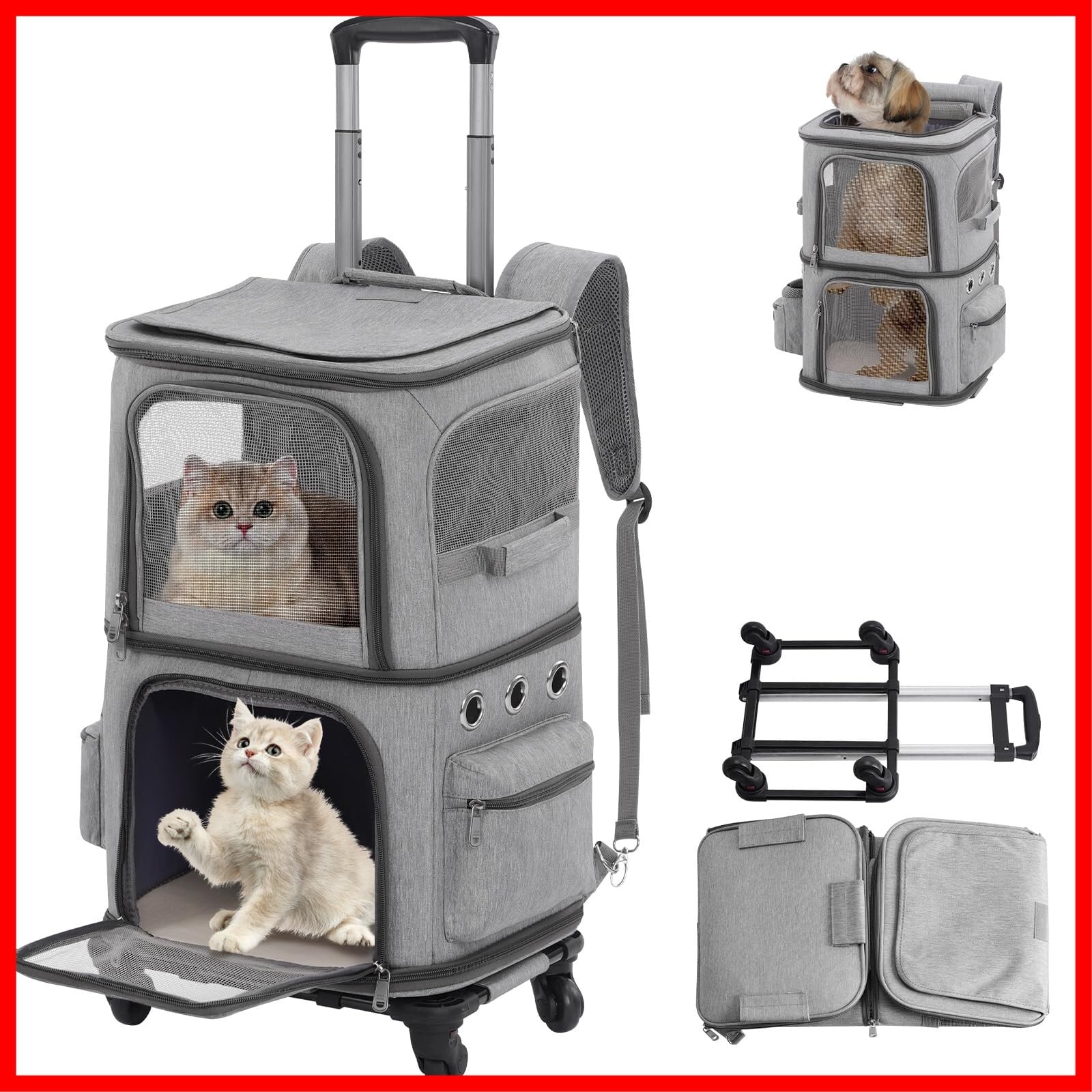 HOVONO 猫 2 匹 キャリー リュック キャスター付き 小型 犬 キャリー カート 2段式 ペット ネコ の トロリーバッグ 大容量 通気性 旅行/通院/交通機関/災害避難用 グレー