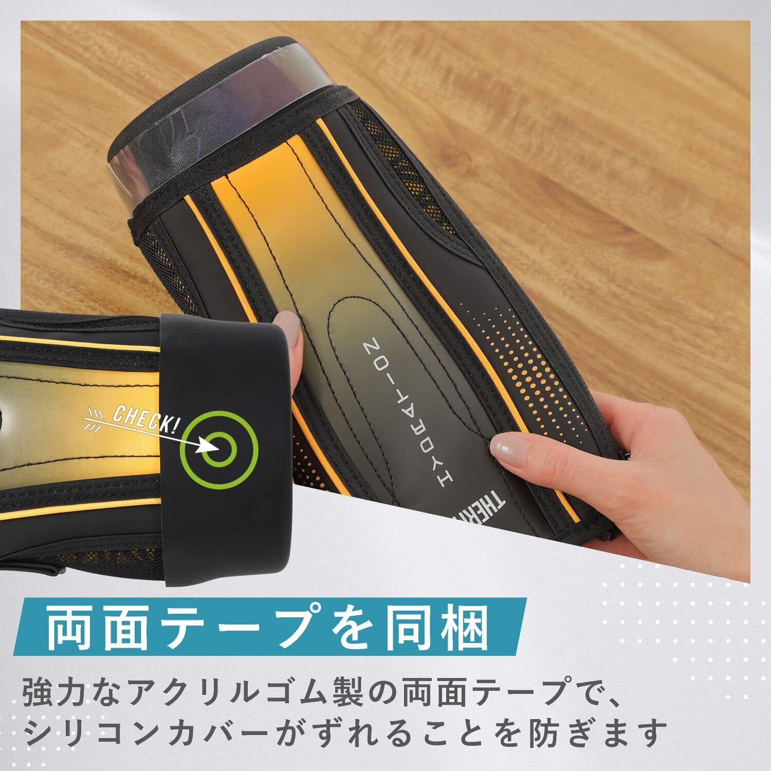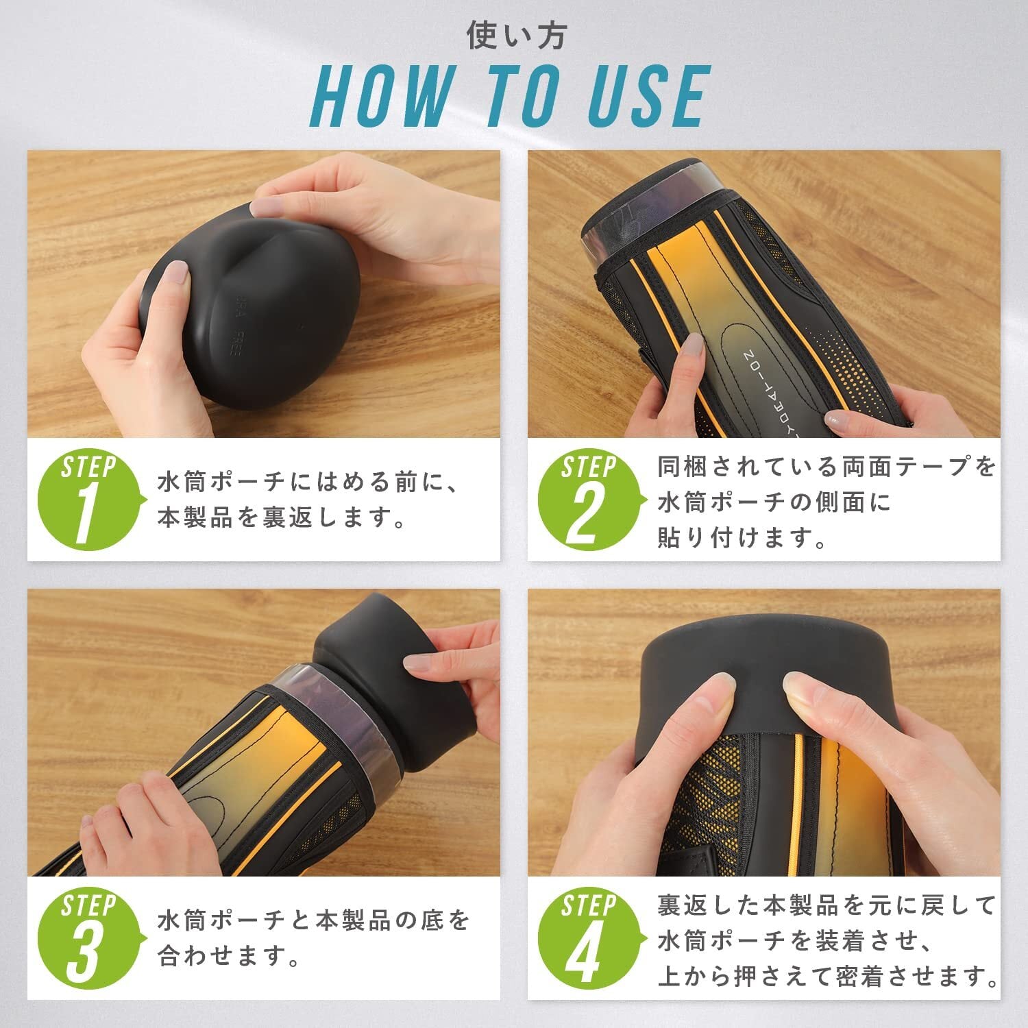 【取付方法】①底カバーを裏返します。②両面テープ(同梱)を水筒ポーチ側面に貼り付けます。③底カバーと水筒ポーチの底を合わせます。④底カバーを元に戻します。⑤上から押さえ、両面テープを圧着させます。水筒ポーチの個体差によりカバーとの間に隙間ができることがあります。その場合は両面テープの上にもう一度両面テープを貼ってください。両面テープを二重に貼ることで隙間を埋めることができます。