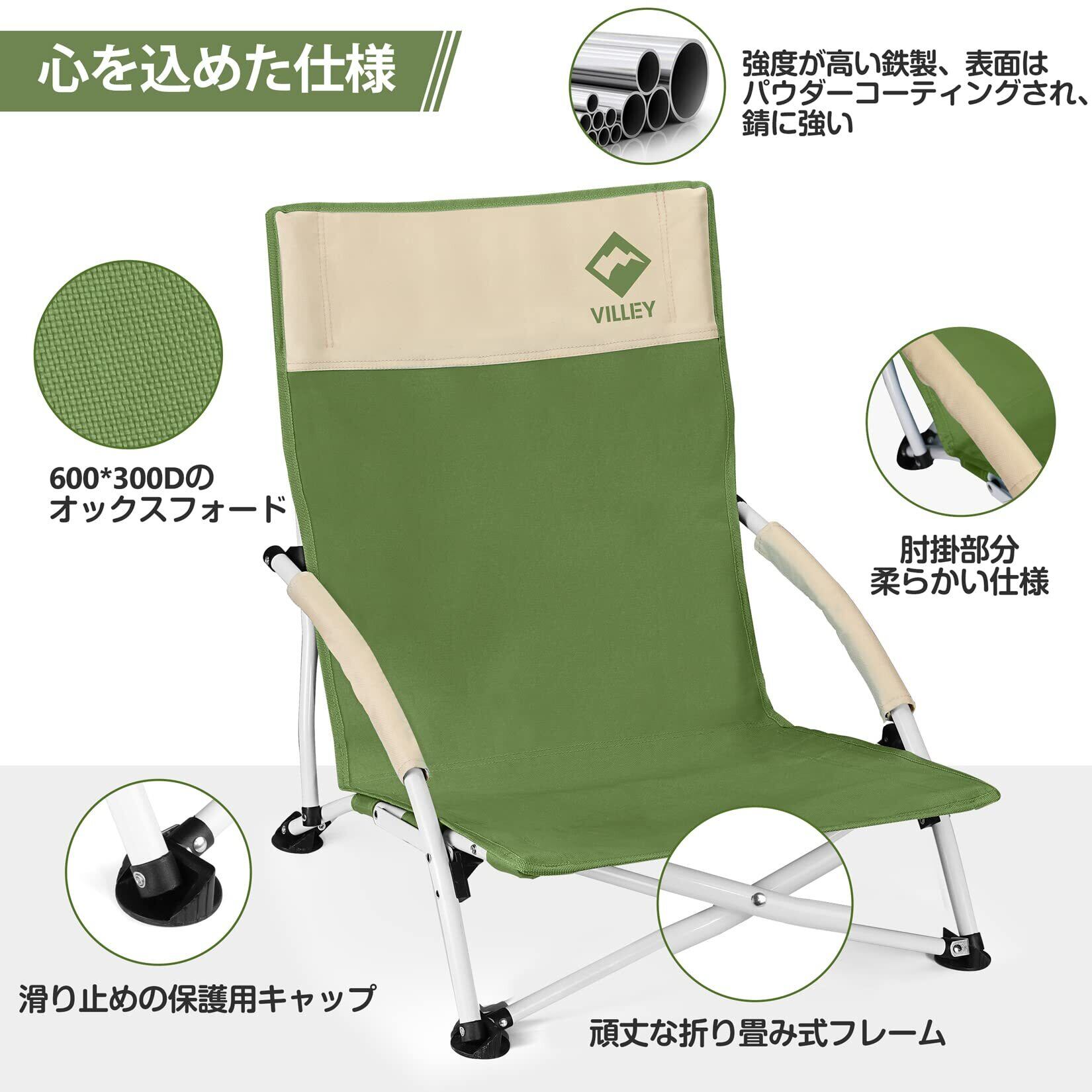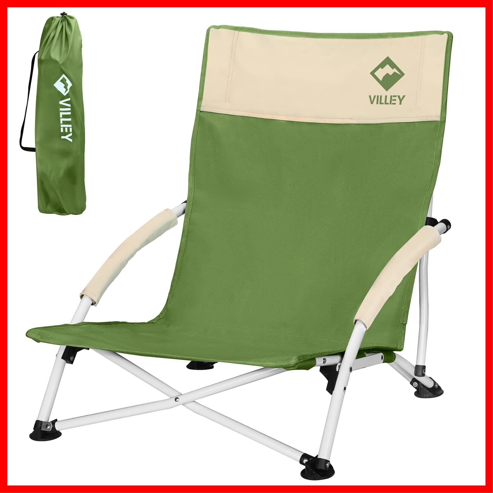 VILLEY アウトドアチェア あぐらチェア ローチェア キャンプ椅子 ロースタイル 折りたたみ イージーチェア 超軽量 コンパクト 耐荷重110kg ハイバック ガーデン お釣り 登山 フィールド 運動会 収納袋付属 グリーン