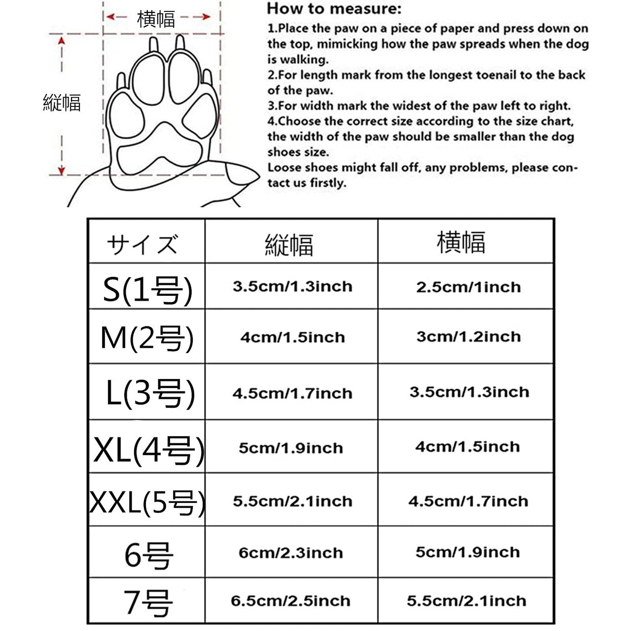 材質:ナイロン、ゴム サイズ:画像をご参照ください。 ナイロン製ブーツは軽量で防水性があります。ストッパーでサイズを調整できるので、履かせやすく抜けにくい。靴の下に滑り止めがあります。 お出かけや散歩の時に、ワンちゃんの肉球を守ることができます。反射材が付いているので、夜の時も安心です。 パッケージ:ブーツ4個セット