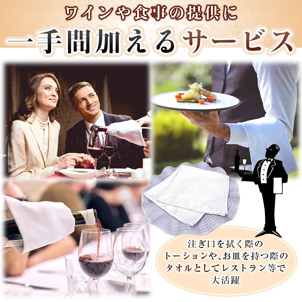 ナプキンとしてだけでなく、ワインソムリエの方にはワイントーションとして・ウエイターやウエイトレスの方には熱いお皿を運ぶ際に役立ちます。