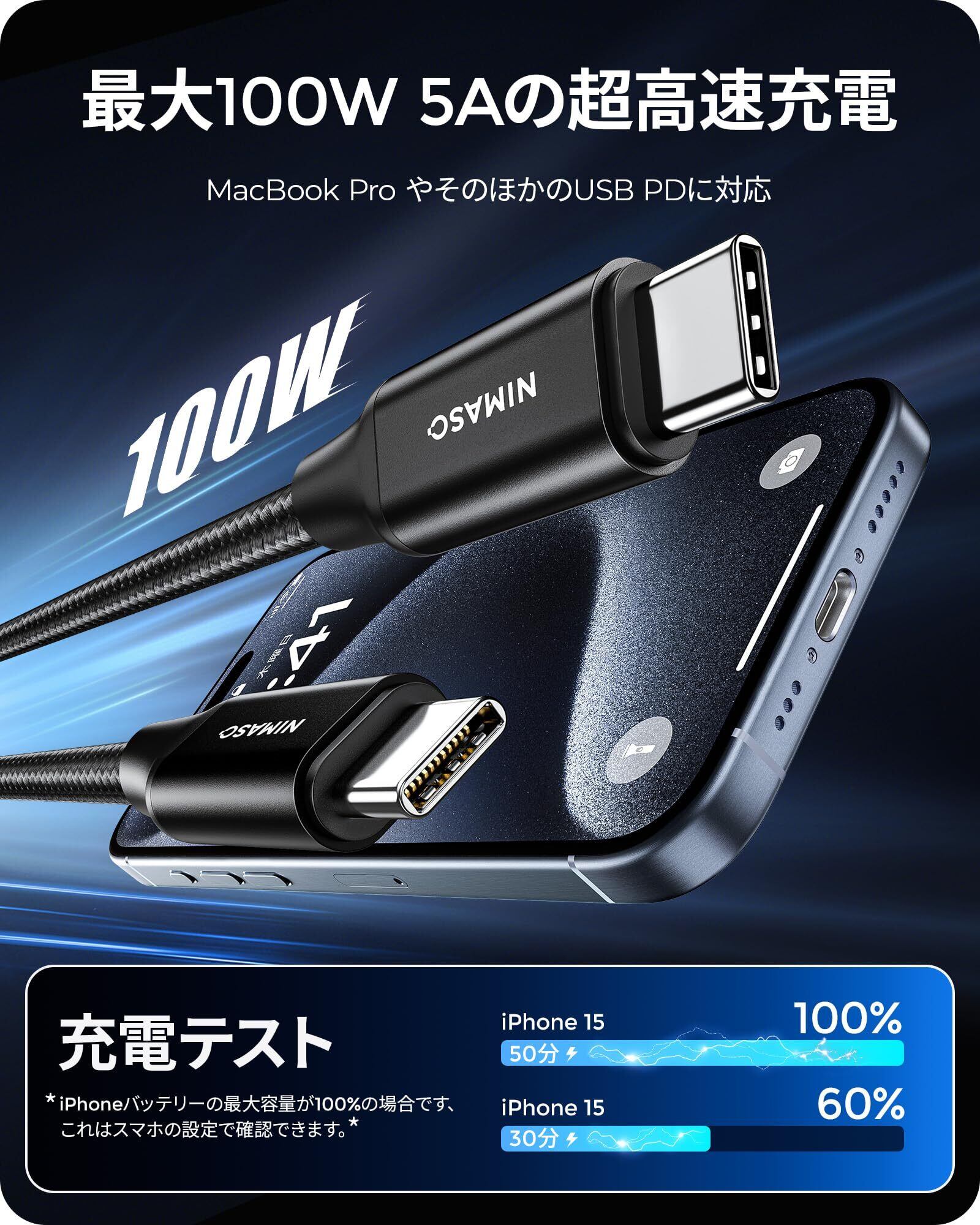 NIMASO USB C Type C ケーブル USB3.2 Gen2【100W/5A急速充電 PD対応 4K / 60Hz 映像出力 1m】 タイプc ケーブル iPhone16/ 15 シリーズ MacBook、iPad mini6、iPad Pro等type c機種対応NCA20C59