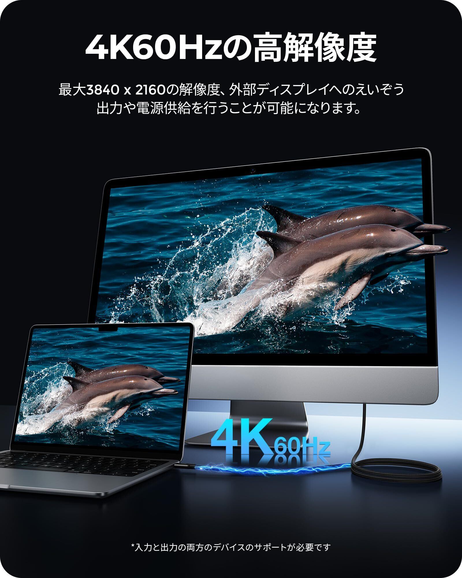 【10Gbpsデータ通信&4K@60Hz高解像度】10GbpsのSuperSpeed規格に対応し、オーディオやビデオ信号だけでなく、HD動画の送受信まで数秒で完了します。本製品はDP Altモードのデバイスでのみ動作し、最大3840 x 2160(4K@60Hz)の解像度を可能にします(出力機器とモニターにDisplayPort Alternate Modeが必要)。