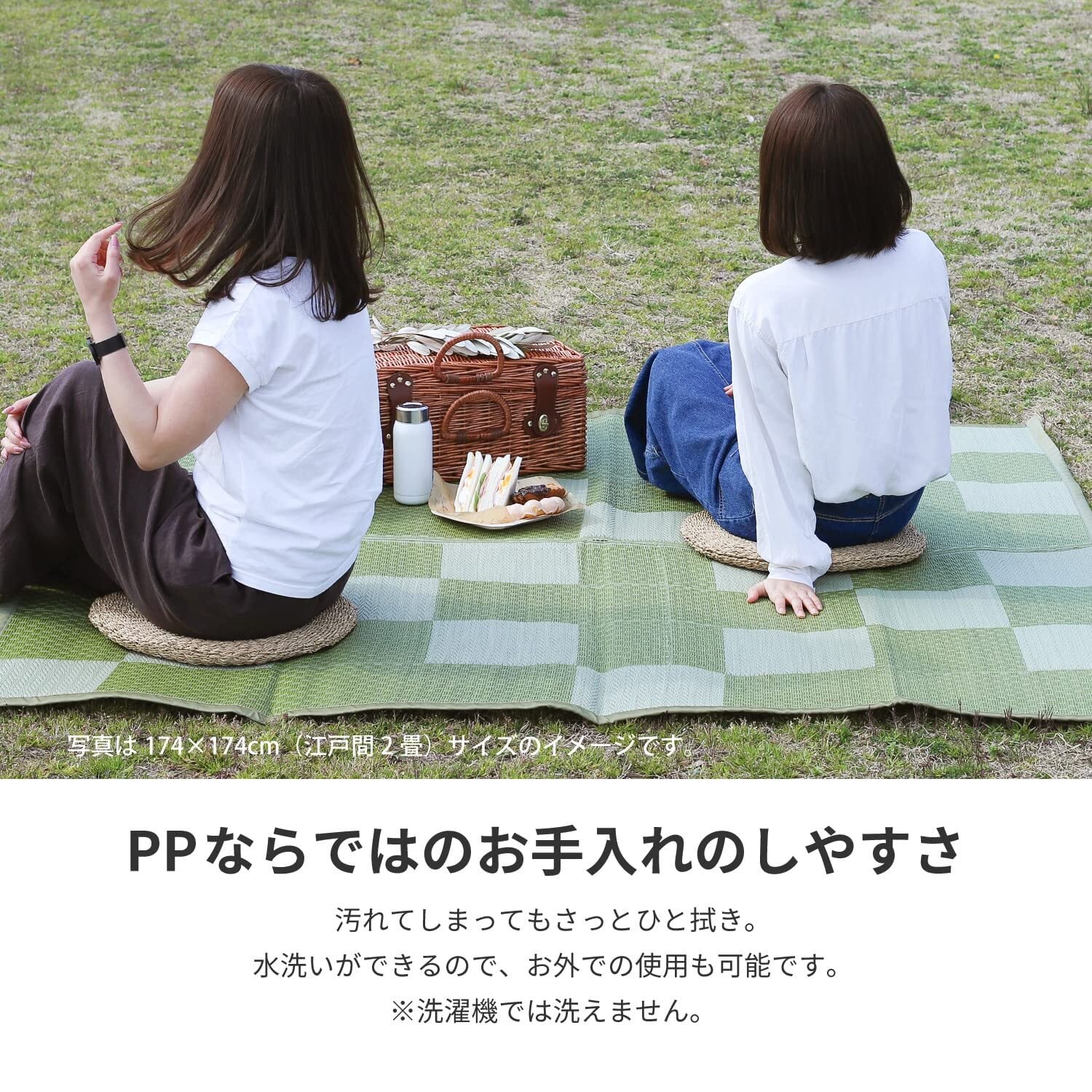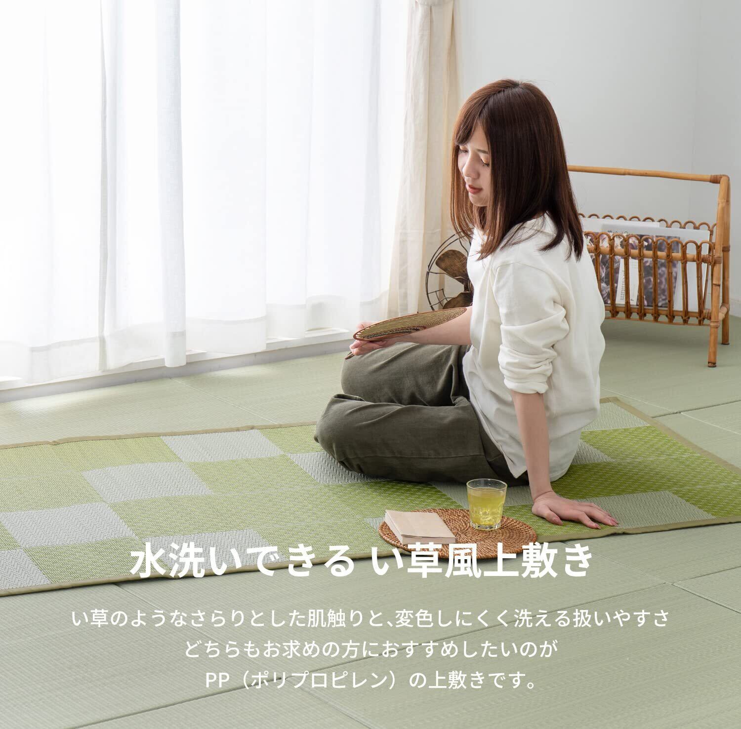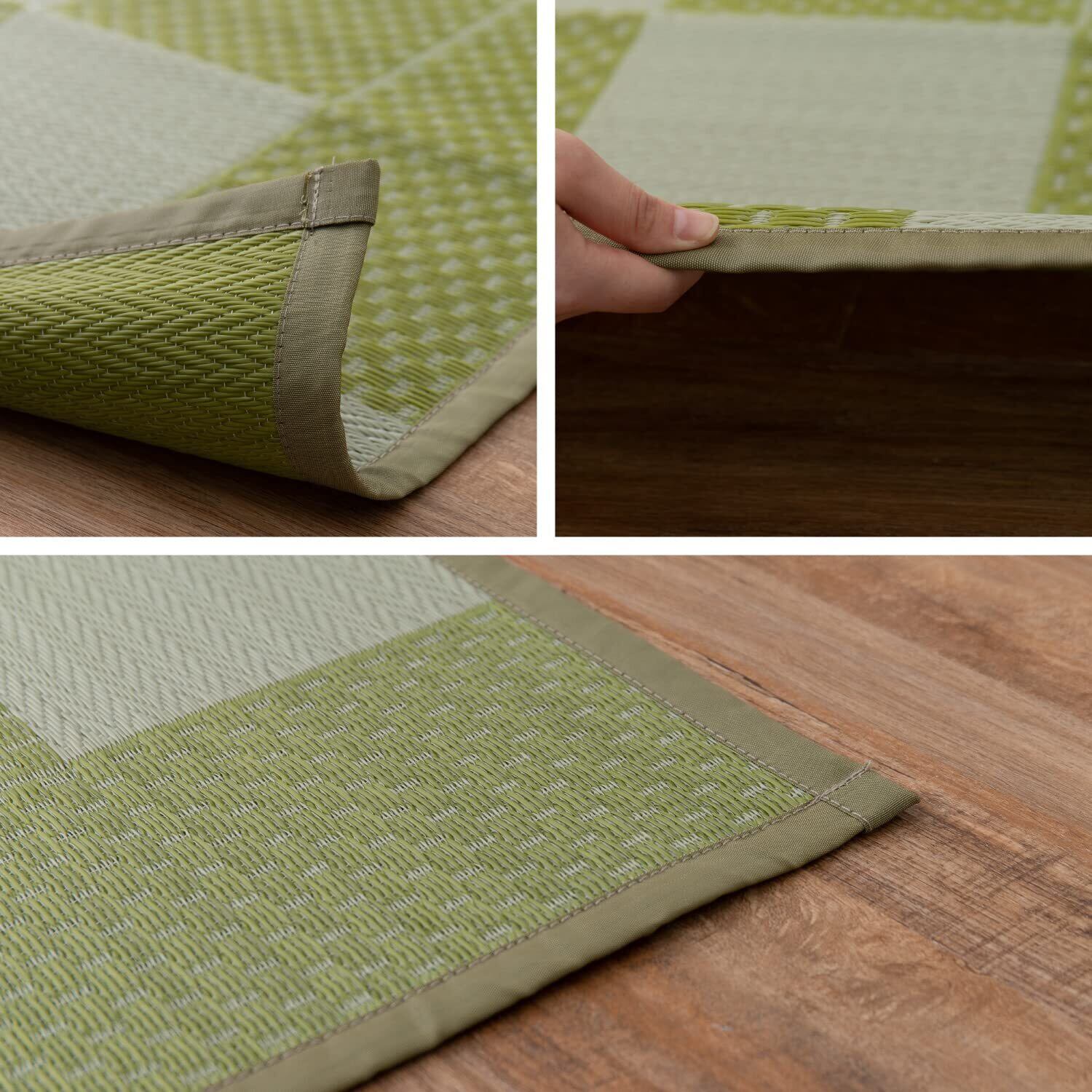 見た目は、い草の上敷きのようですが、実は、ポリプロピレン素材などを使用して織り込んだ敷物で、強度がしっかりとしています。水こぼしや汚れに強く、お手入れも簡単だから、小さなお子様やペットのいるご家庭にもおすすめです。