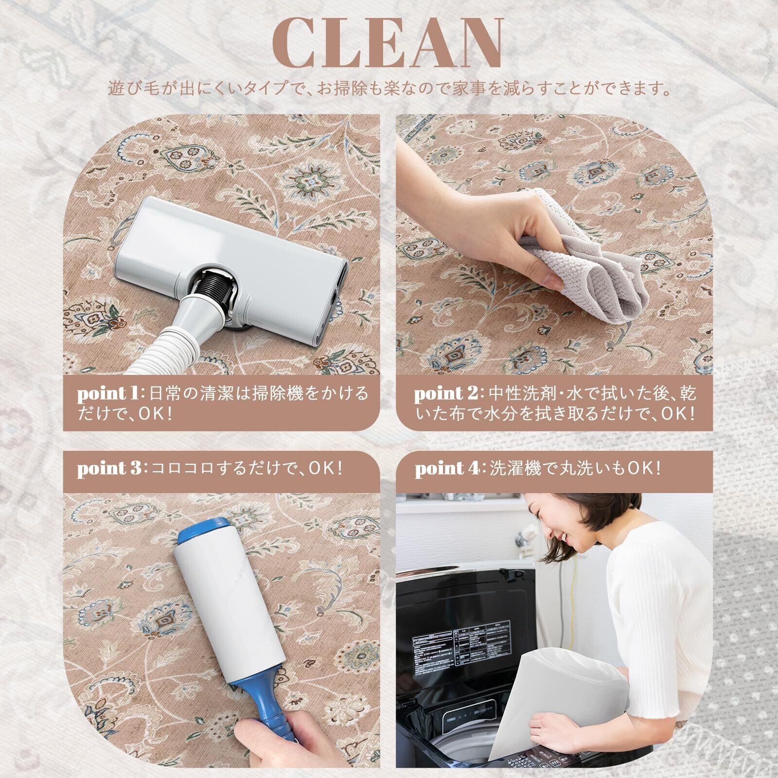 【お手入れ便利】毛足がないので、ゴミが絡みにくく、日常の清潔は粘着クリーナーをコロコロするや掃除機をか けるだけでキレイになります。また、汚れた場合は手洗いや洗濯ネットに入れて洗濯機で洗うことができます(ご 注意:風通しの良いところで陰干しし、アイロン、乾燥機の使用をお避け下さい。)