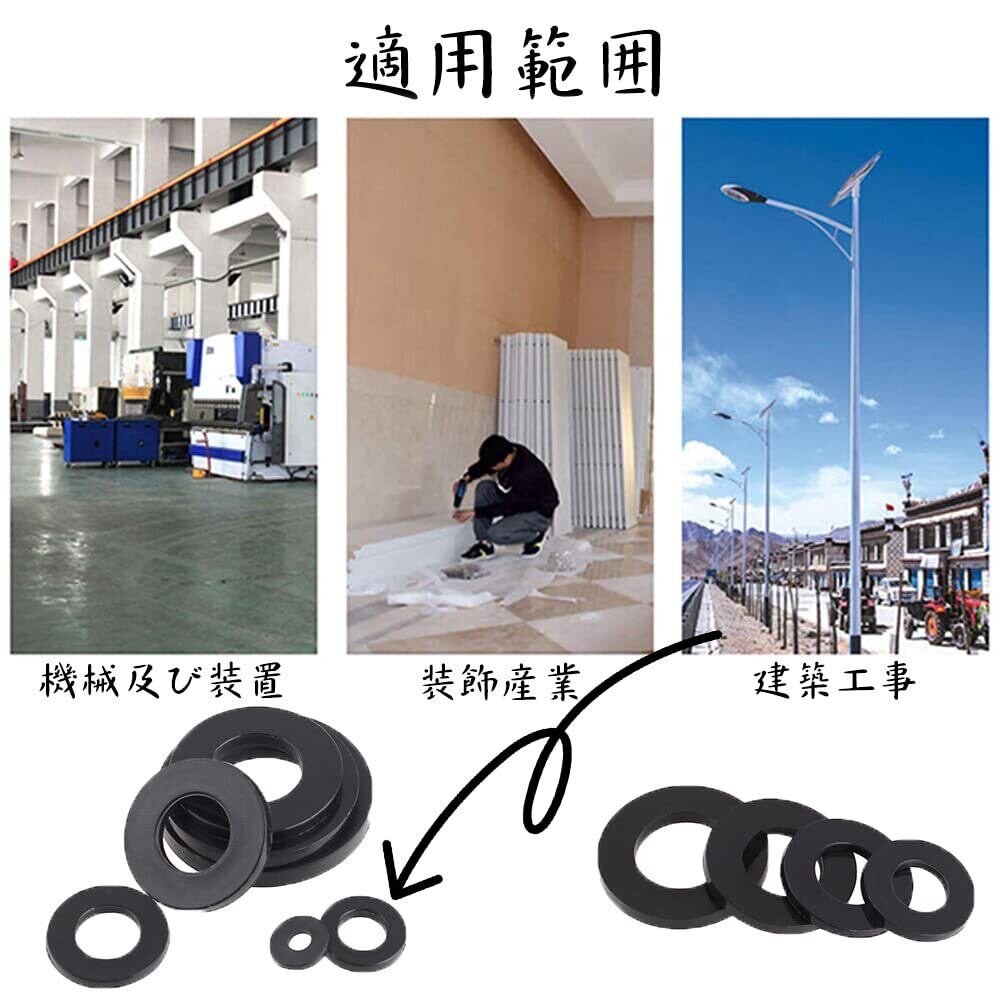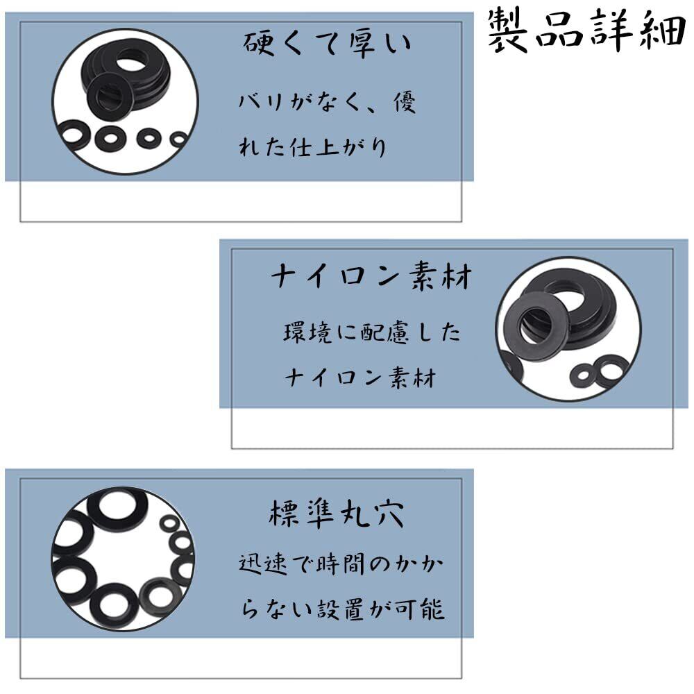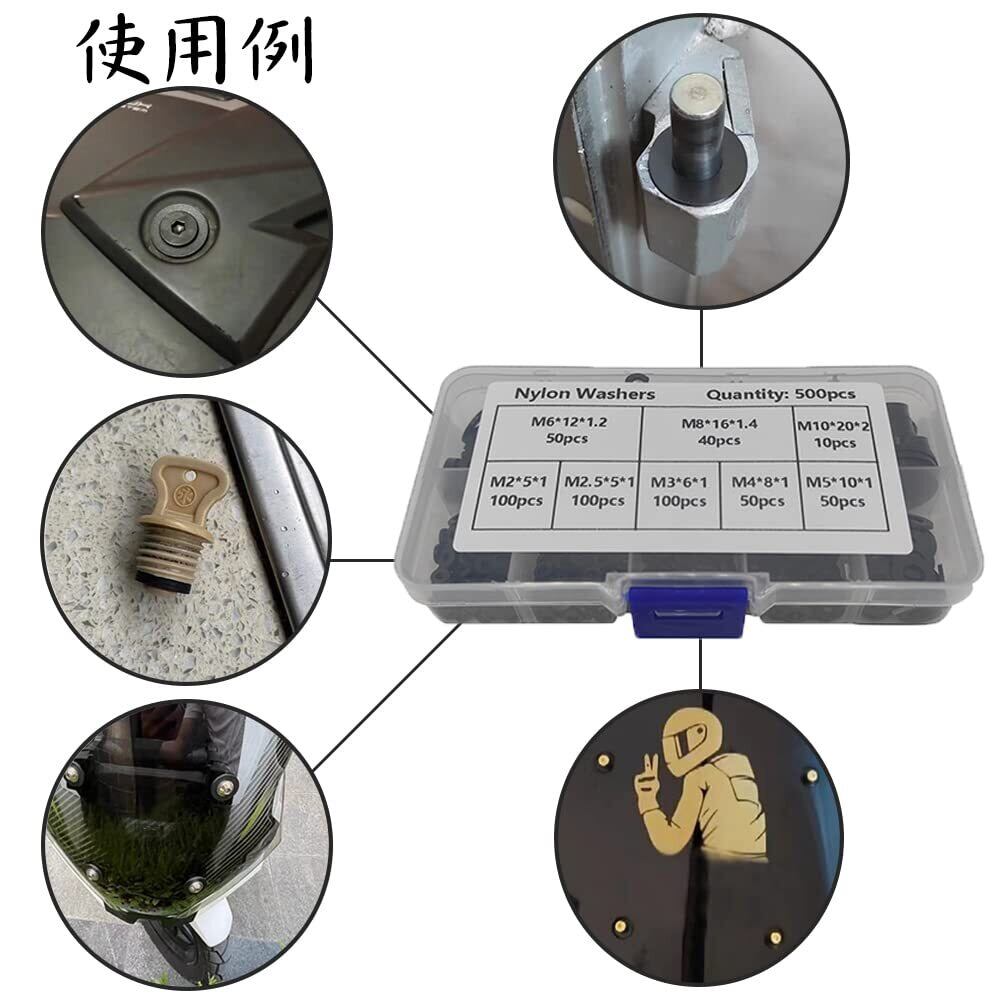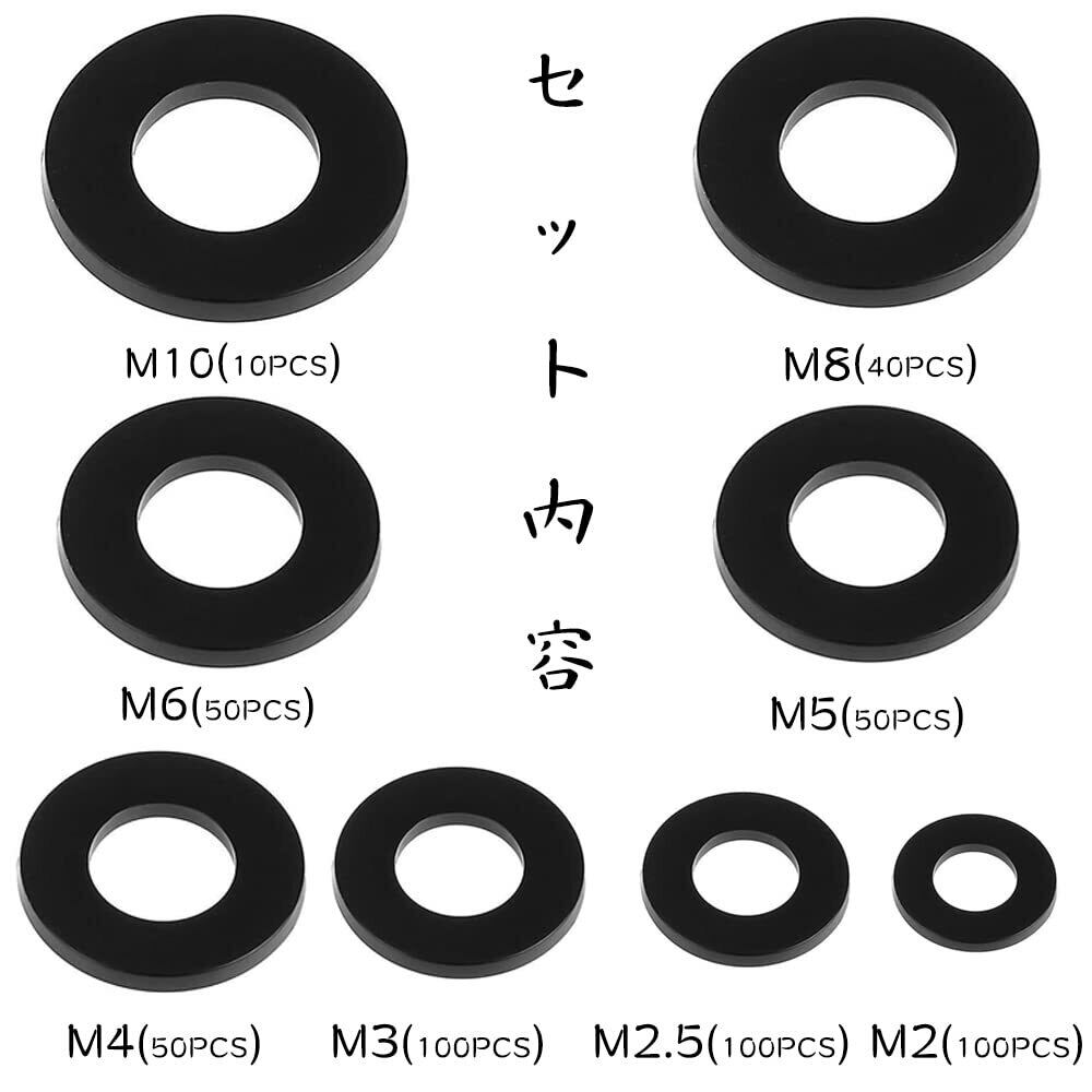 セット内容:黒ナイロンワッシャー M2 (100PCS)M2.5 (100PCS)M3 (100PCS)M4 (50PCS)M5 (50PCS)M6 (40PCS)M8 (40PCS)M10 (10PCS)。