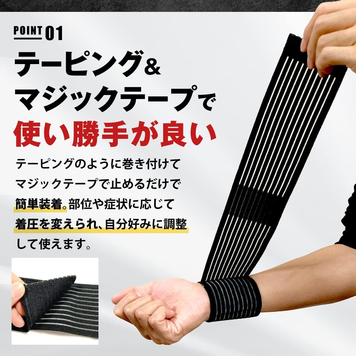 【さまざまな部位で使える】テーピングのように巻き付けてマジックテープで止めるだけで簡単装着。部位や症状に応じて着圧を変えられ、自分好みに調整して使えます。