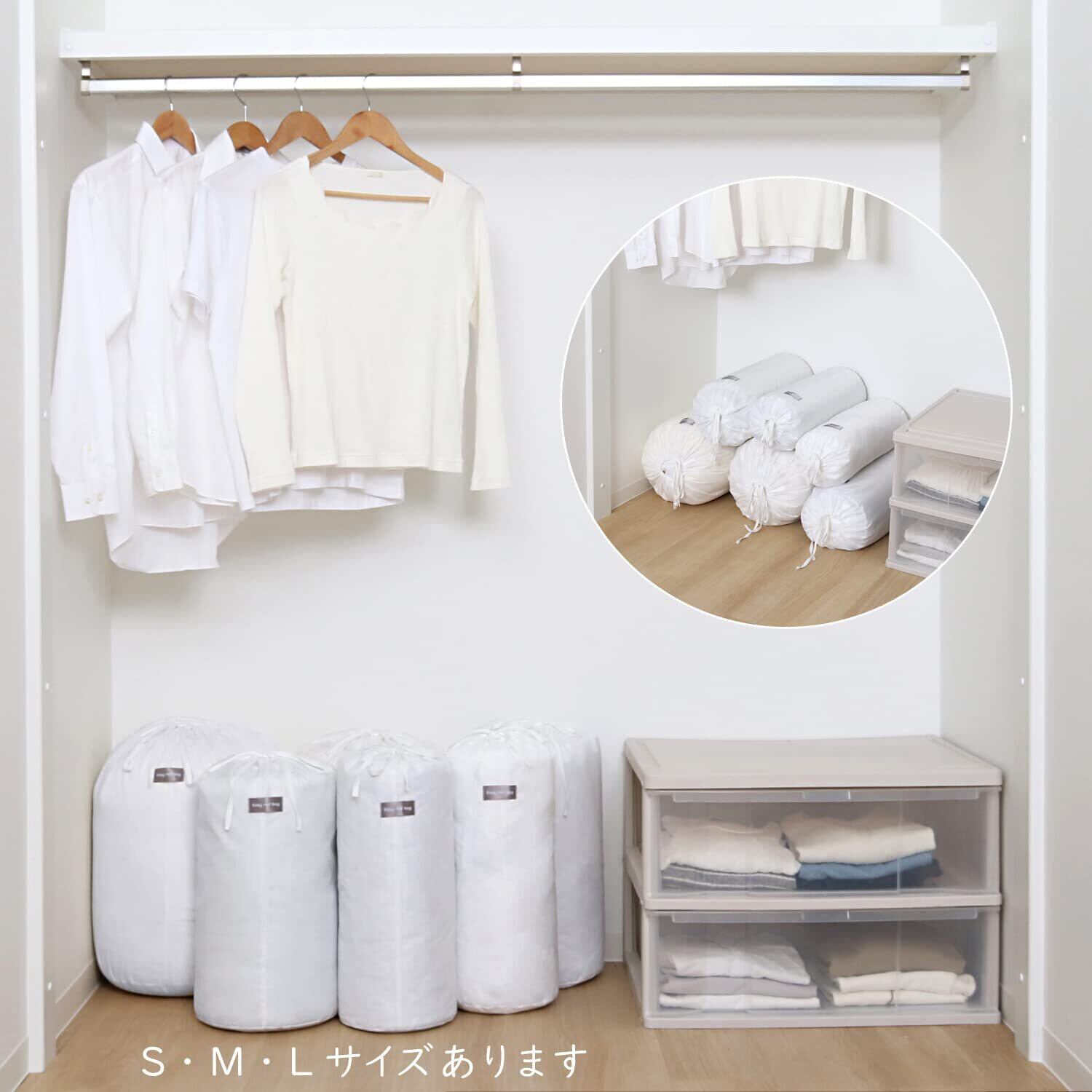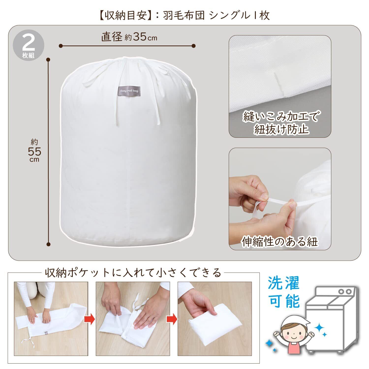 商品名:Easy roll bag L white 2枚組サイズ:約直径35×高さ55cmカラー:ホワイト材質:ポリエステル内容:2枚生産国:中国【収納目安(1枚あたり)】●シングルサイズの羽毛布団なら1枚【特長】●くるくると丸めて入れるだけ。長細い巾着袋で簡単にスッキリ収納。●内ポケットで巾着の口をカバーすることで、ホコリが入るのを防ぐ。●使わないときは折りたたんで、内ポケットに収納できコンパクトに。●クローゼットや押入れに立てて並べたり、積み重ねたりして保管できる。●車で旅行やキャンプへ行く際のクローゼットからの持ち出しもスムーズ。【ご注意】●長時間濡れたまま放置しないでください。●アイロン掛けの際は当て布をしてください。●取扱い表示をよくご確認のうえ、正しくお取り扱いください。【ASTRO CO., LTD】1970年創業、不織布収納日用品として「アストロ」のオリジナル商品を販売しています。生地の開発から製造、流通、品質管理を自社管理。収納用品をメインに多彩な日用品を企画販売してまいりました。アストロは暮らしを楽しく便利にさせる商品をこれからも創造し続けます。established in 1970