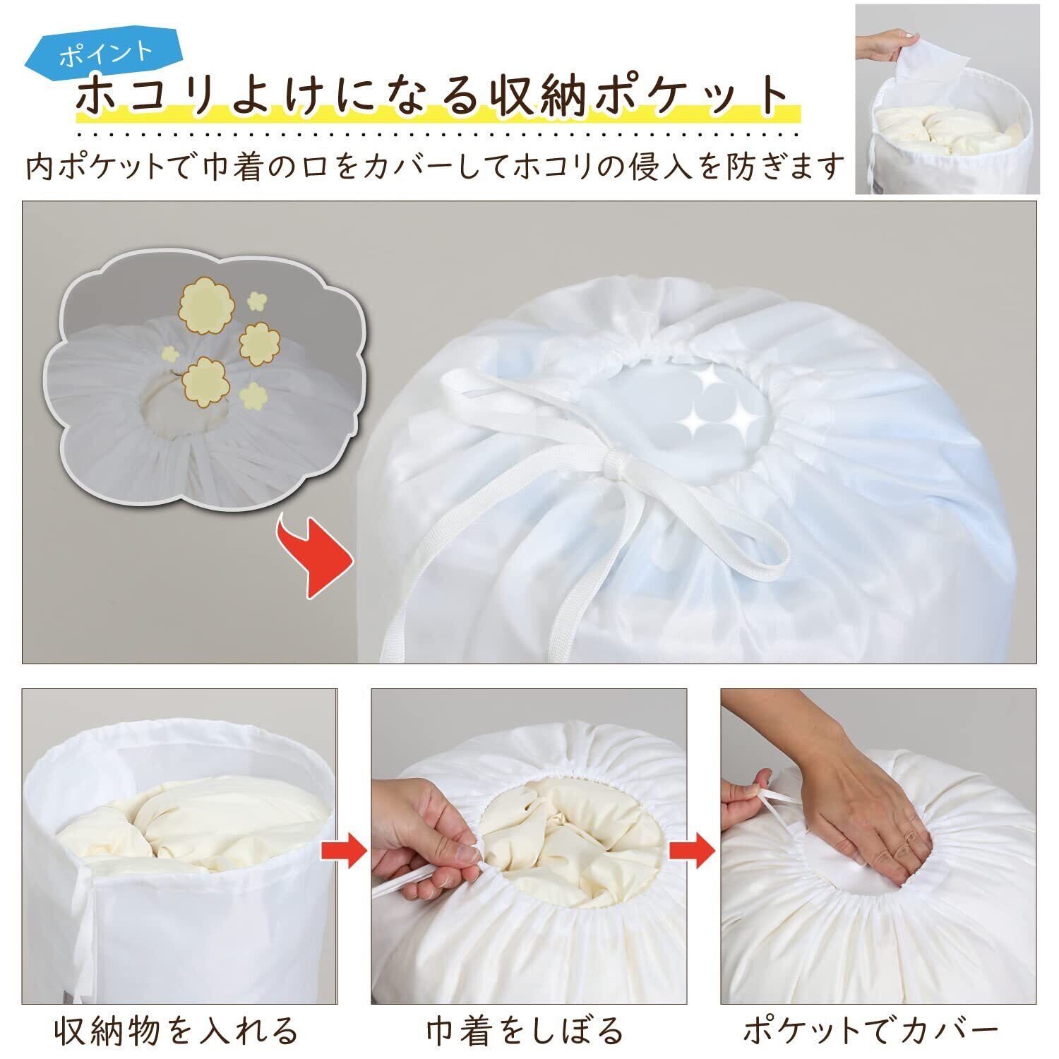【簡単くるくる丸めて入れるだけ】:くるくると丸めて入れるだけ。長細い巾着袋で簡単にスッキリ収納。