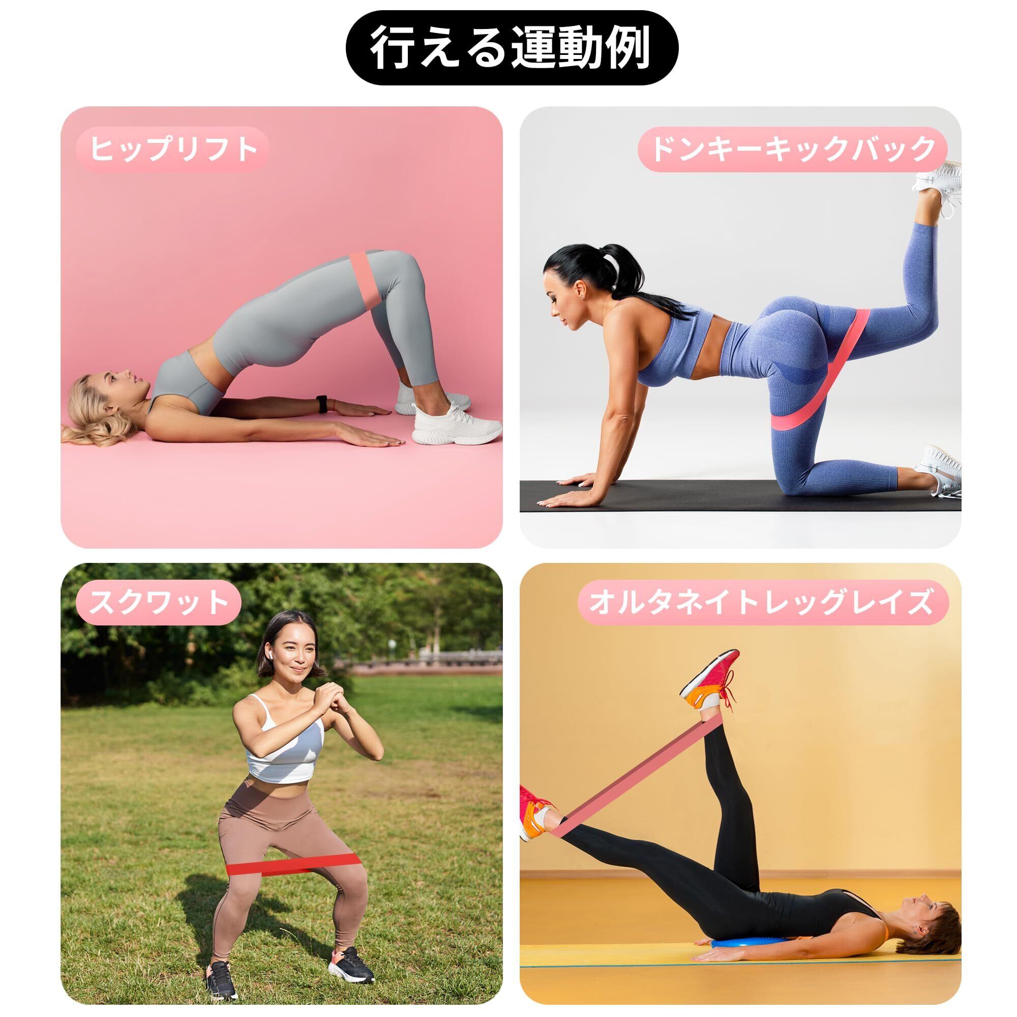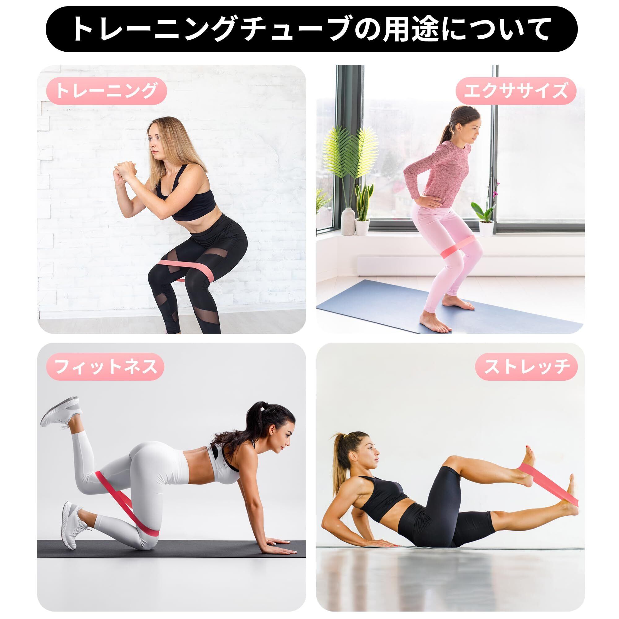 【5から59kgまで負荷が変えられます】5種類の負荷のトレーニングバンドがあり、組み合わせて自分にあった負荷を調節できます。幅が広く負荷をかけた時の安定感が抜群です。ゴムバンドは自在に伸縮できますので、筋トレ、体幹トレ、ストレッチ、美尻など幅広く活用できます。ちなみに、普段鍛えられなかった内転筋はスクワットでトレーニングできます。
