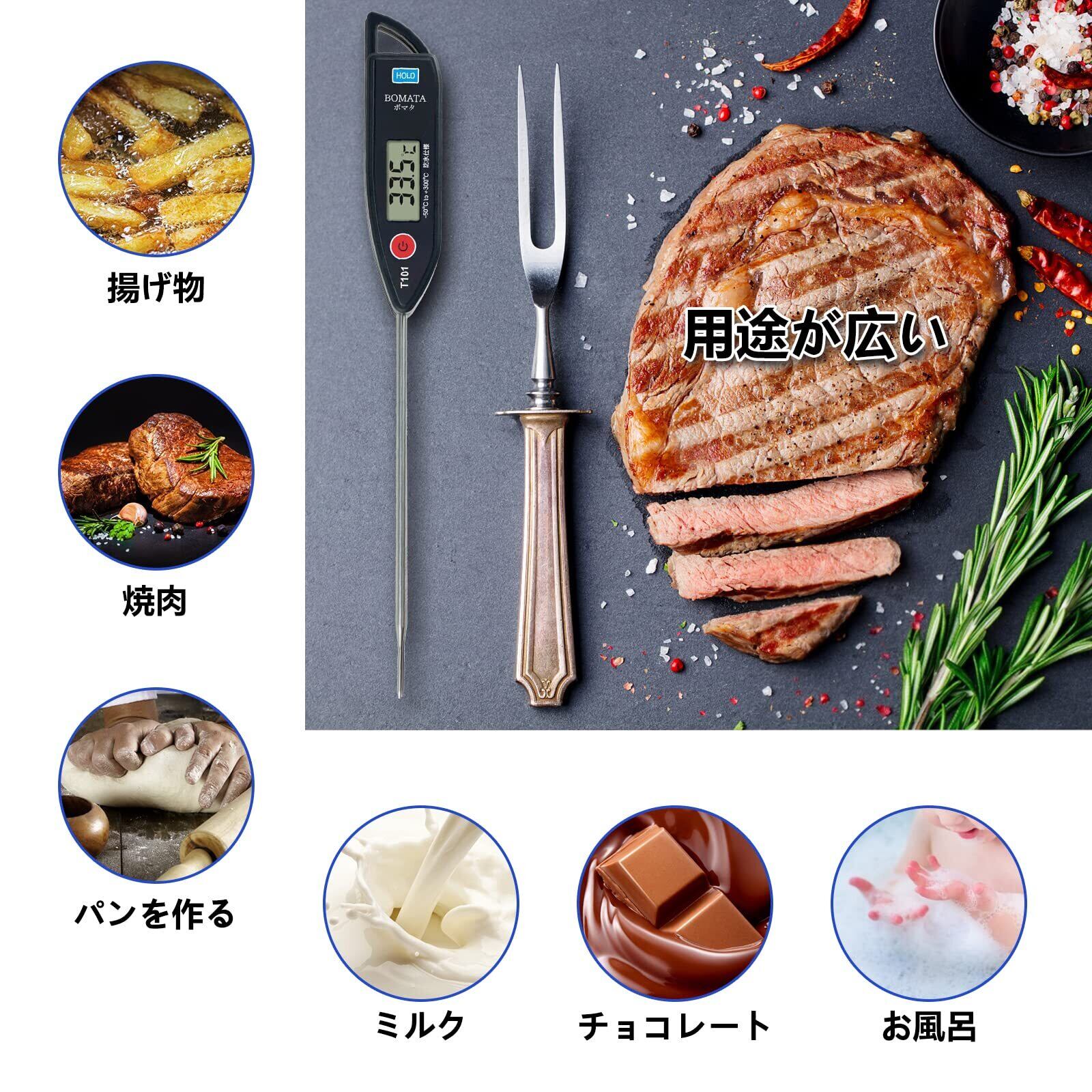 BOMATA 温度計 料理 防水 丸洗い 速読3~6秒 -50~300℃ 水温計 キッチン 12.7cmのプローブ ホールド機能付き LCD大画面 304ステンレス 壁掛け穴 揚げ物 油温 てんぷら お肉 お風呂 牛乳などの温度測量用 調理用 T101A黒い