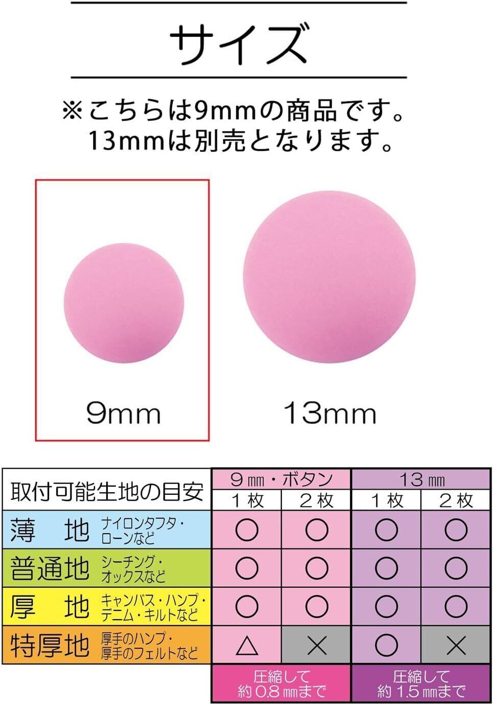 プラスナップのサイズ:直径約9mm / 取り付けに最適な 生地 の厚み:圧縮して約0.8mm