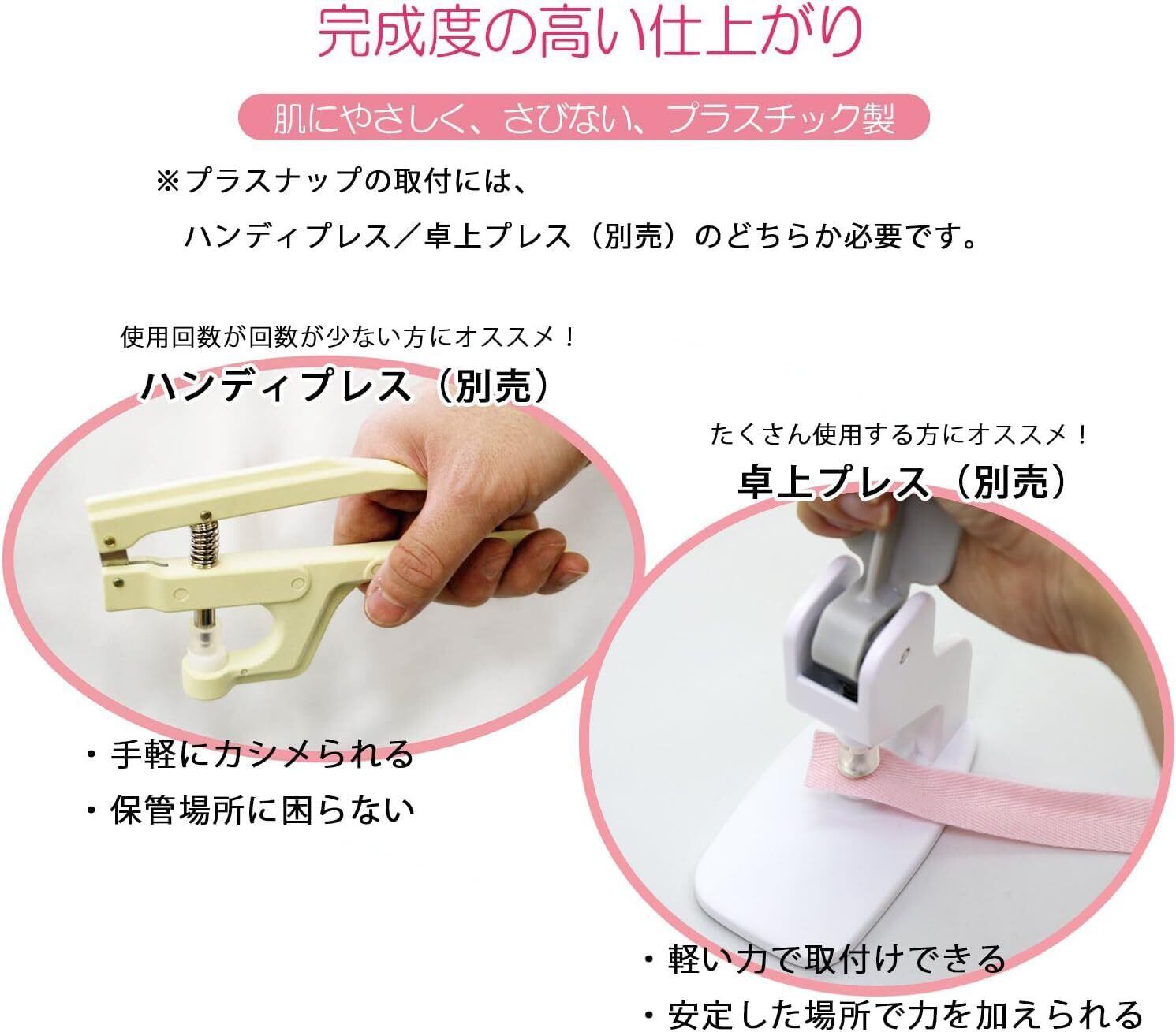 糸 ・ 針 不要で取り付けられる プラスナップ 。 金属アレルギー の方にも安心の プラスチック 製。