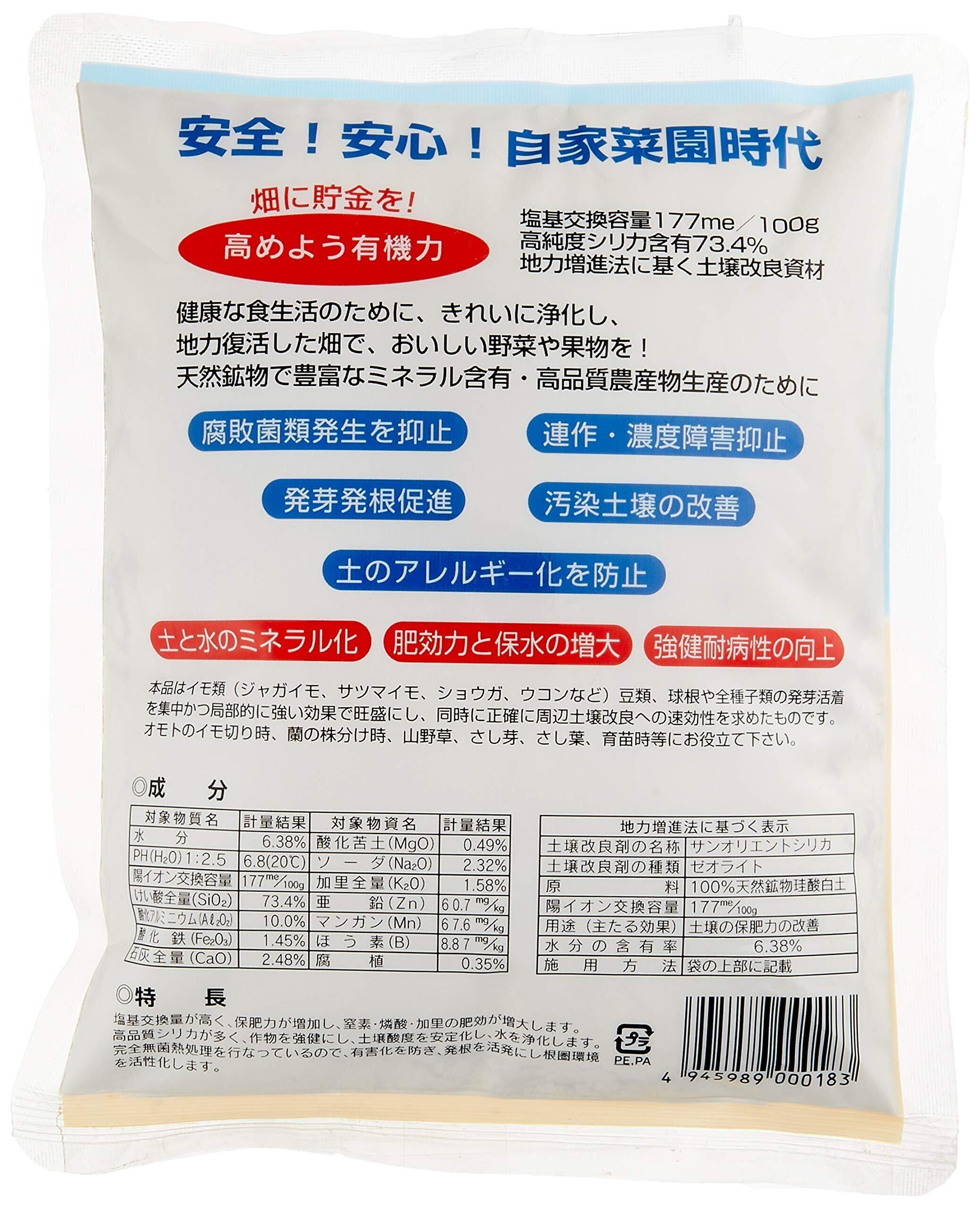 厳選した鹿児島産ゼオライトを100%利用した根圏環境活力天然鉱物資材です。イモ類(じゃがいも、里芋、さつまいも、ショウガ、ウコンなど)、豆類、球根や全種子類の発芽活着を促進します。周辺土壌改良と、活力化への速効性も期待できます。
