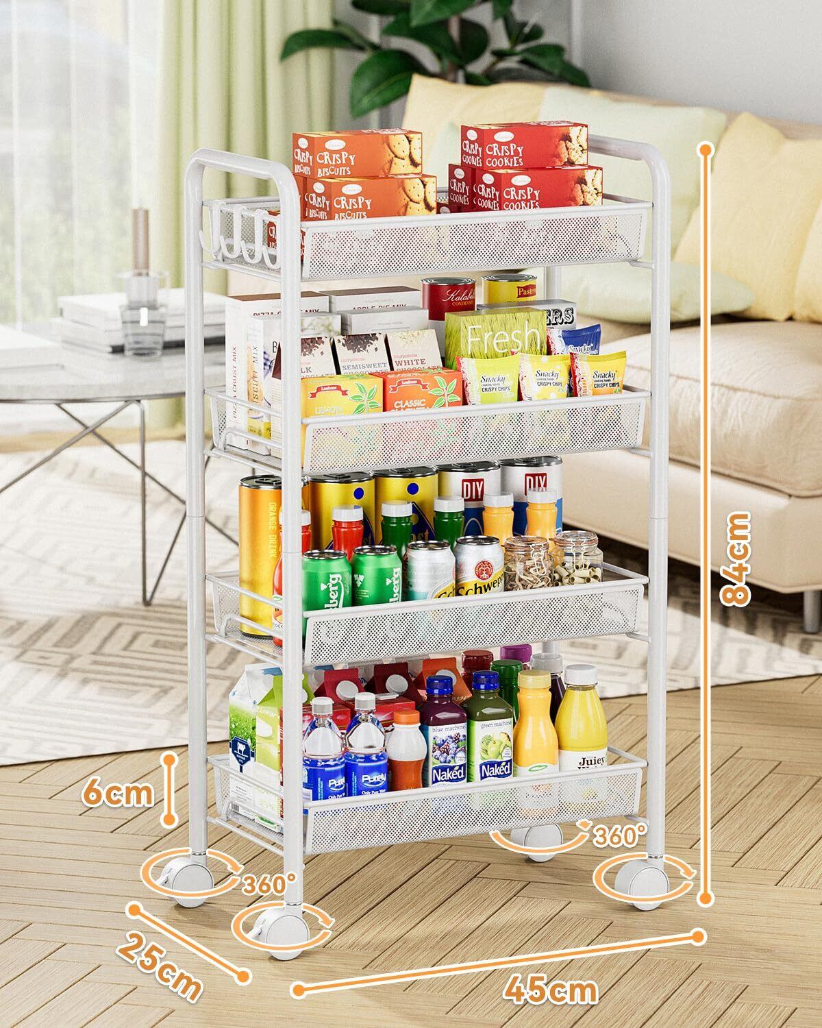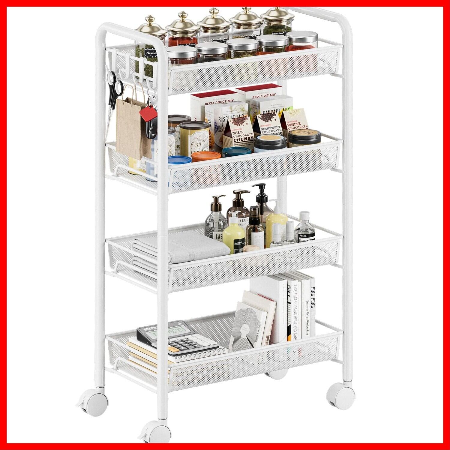 EKNITEY メタルラック キッチンワゴン メタル収納カート メッシュ キッチン カート 防錆 小物収納 サイドワゴン 4段 幅26.5×奥行45.5×高さ84.5cm ホワイト