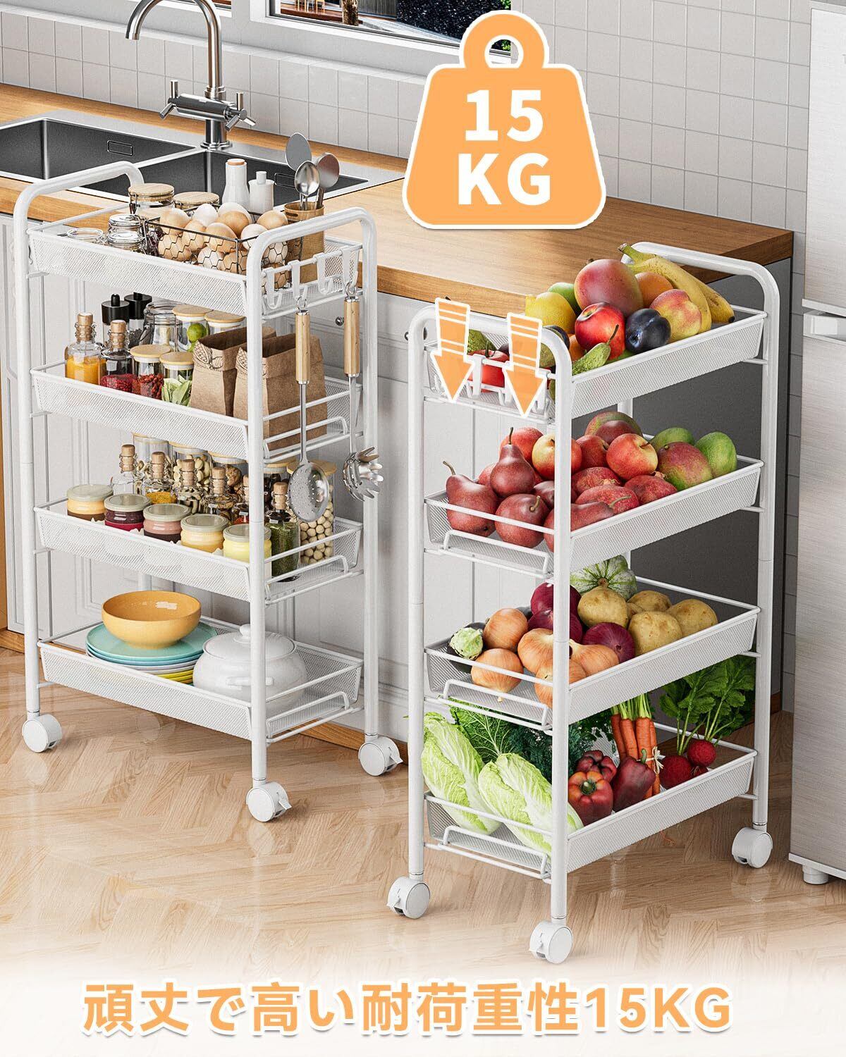 【耐荷重】-収納台車はしっかりした構造です。棚板1枚あたりの耐荷重15kg、様々な物品に対応できます。