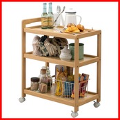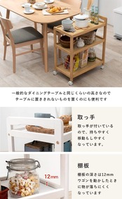 【取っ手付きで移動がしやすい】:取っ手付きで移動がしやすい木製キッチンワゴン。鍋や食器類、調味料、食材を多く収納しても移動がラク!高さがあるものも一つのワゴンに収納すれば見た目もすっきり。3段棚は各棚約5kgまで物を載せられ、スリムな見た目ながら大容量。