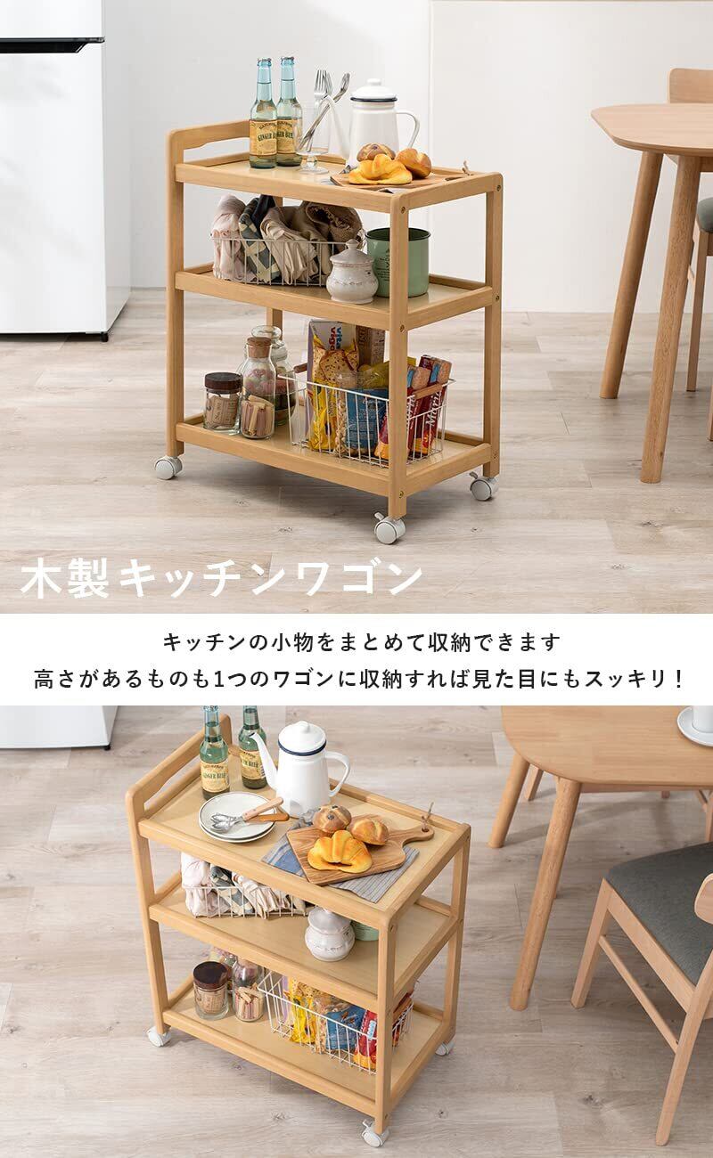 シンプルで使いやすいキッチンワゴン。キッチン周りの小物や調味料等がまとめて収納できます。収納スペースの高さが2種類あるので高さがあるものもスッキリ収納。キャスターが付いているので移動もラクラク。ストッパーも付いているので固定も簡単にできます。また、一般的なダイニングテーブルと同じくらいの高さなので、サブテーブルとして活用することも可能です。さらにシンプルなデザインだから、ランドリーやデスク周りでもご使用いただけます。【商品サイズ(約)】幅59×奥行34×高さ73cm【重量(約)】6kg【素材】天然木【表面加工】ラッカー塗装【生産国】ベトナム【備考】家具の上に加熱したなべ・やかん等を直接置かないでください。