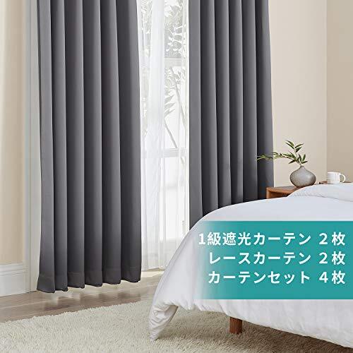 Hansleep カーテン 1級遮光 4枚組 グレー 幅100cm丈135cm UVカット 断熱 防寒 防音 省エネ 厚手 無地 おしゃれ カーテンセット 洗える 寝室 リビング用 (ドレープカーテン2枚・レースカーテン2枚) | hananoki