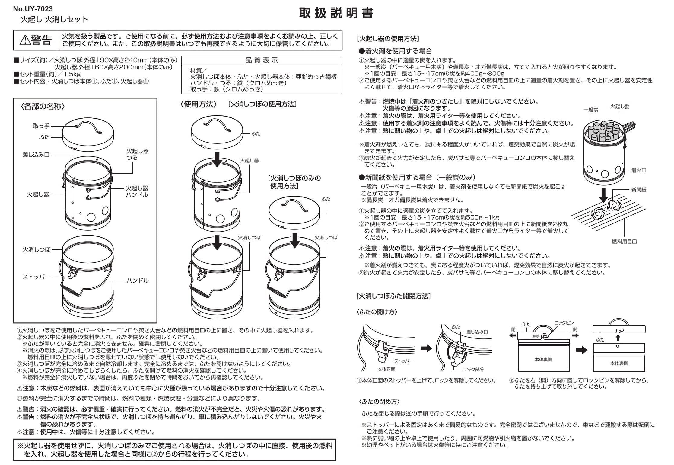 材質:火消しつぼ本体・ふた・火起こし器本体/亜鉛めっき鋼板、ハンドル・つる・取っ手/鉄(クロムめっき)、原産国:中国
