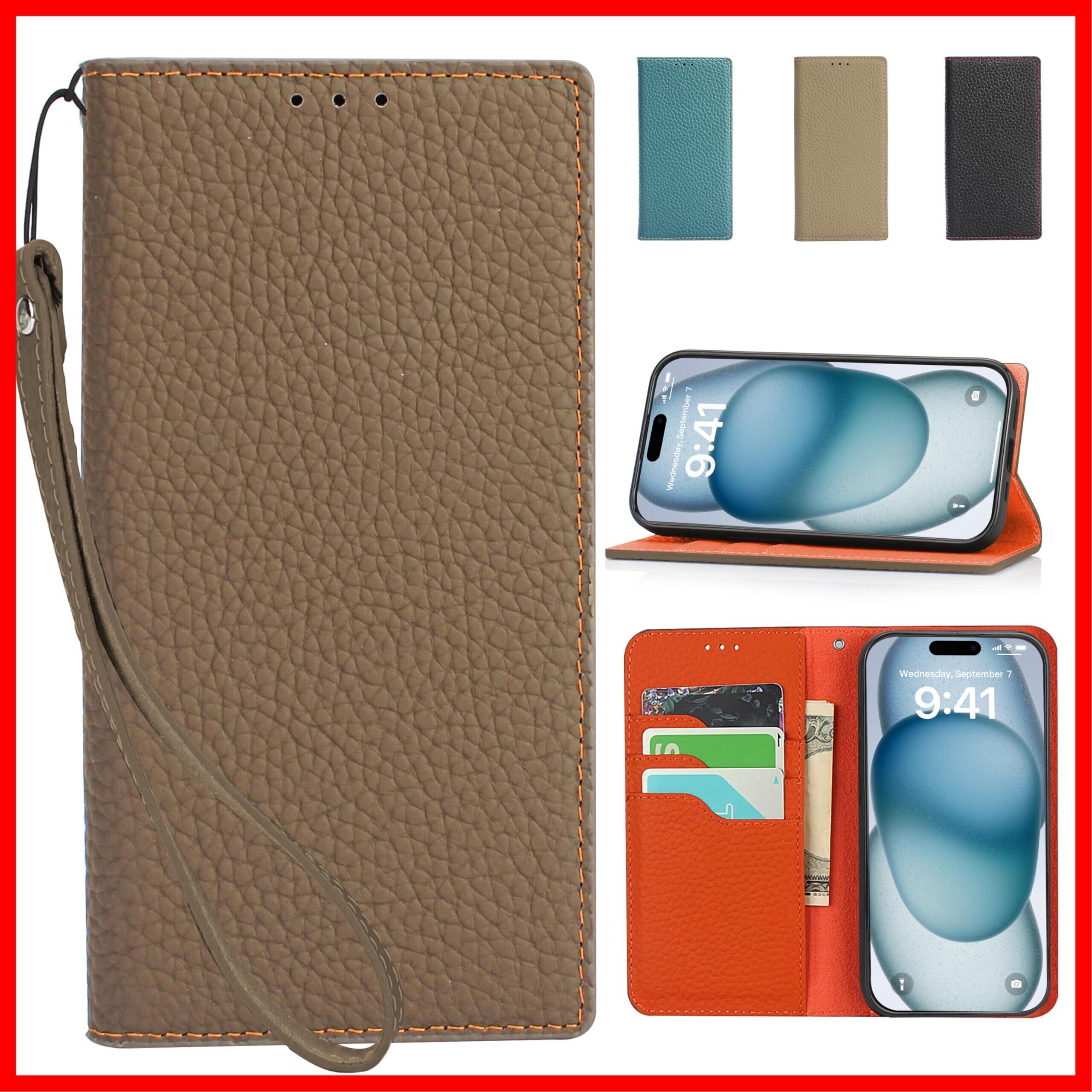 CLICSUN iPhone15 対応ケース 高級牛本革ケース 手帳型 アイフォン15 対応 カバー 本革 レザー いPhone15 カバー スタンド機能 ストラップ付き マグネット式 カードポケット ブラウン×オレンジ | hananoki