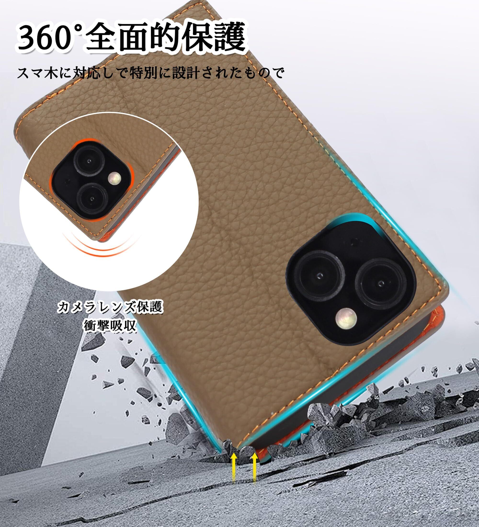 CLICSUN iPhone15 対応ケース 高級牛本革ケース 手帳型 アイフォン15 対応 カバー 本革 レザー いPhone15 カバー スタンド機能 ストラップ付き マグネット式 カードポケット ブラウン×オレンジ