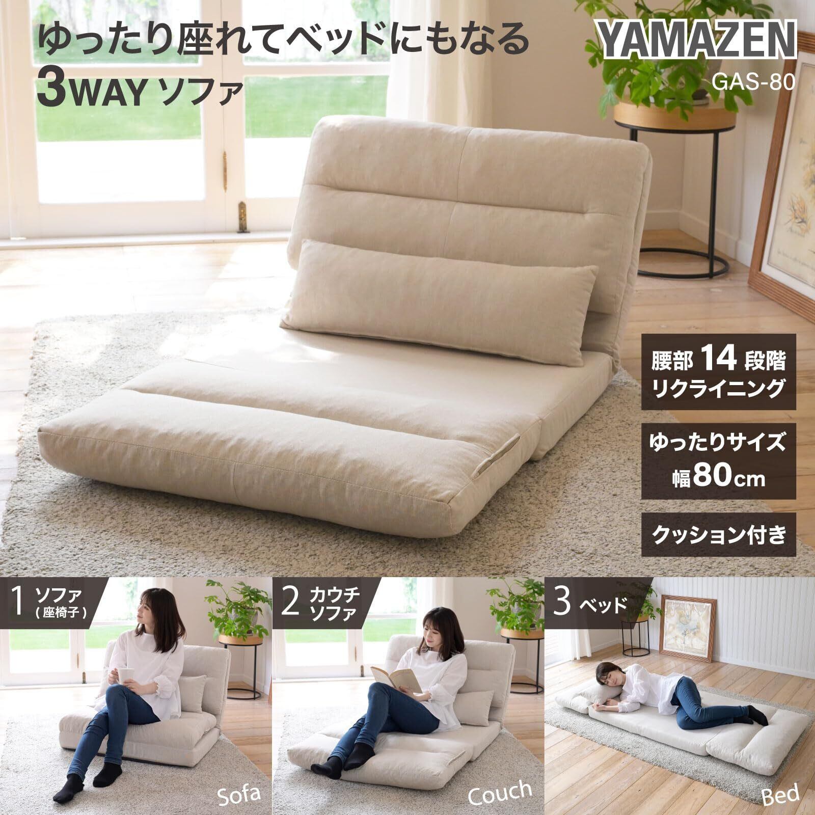 山善(YAMAZEN) ソファ ソファーベッド 座椅子 3WAY ゆったり 一人掛け クッション付き 腰部14段階 リクライニング 簡易ベッド ローソファ 幅80×奥行70/193.5×高さ13.5/57cm 一人暮らし 完成品 アイボリー GAS-80(IV)
