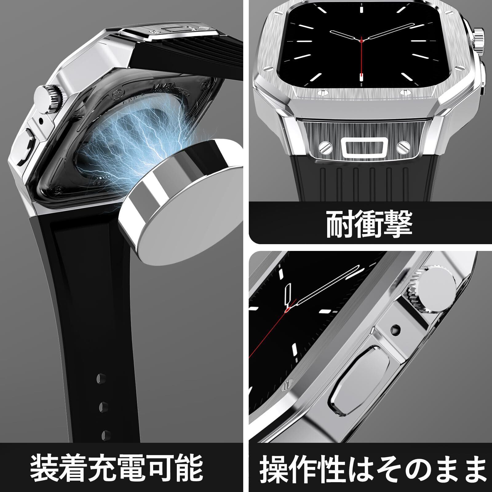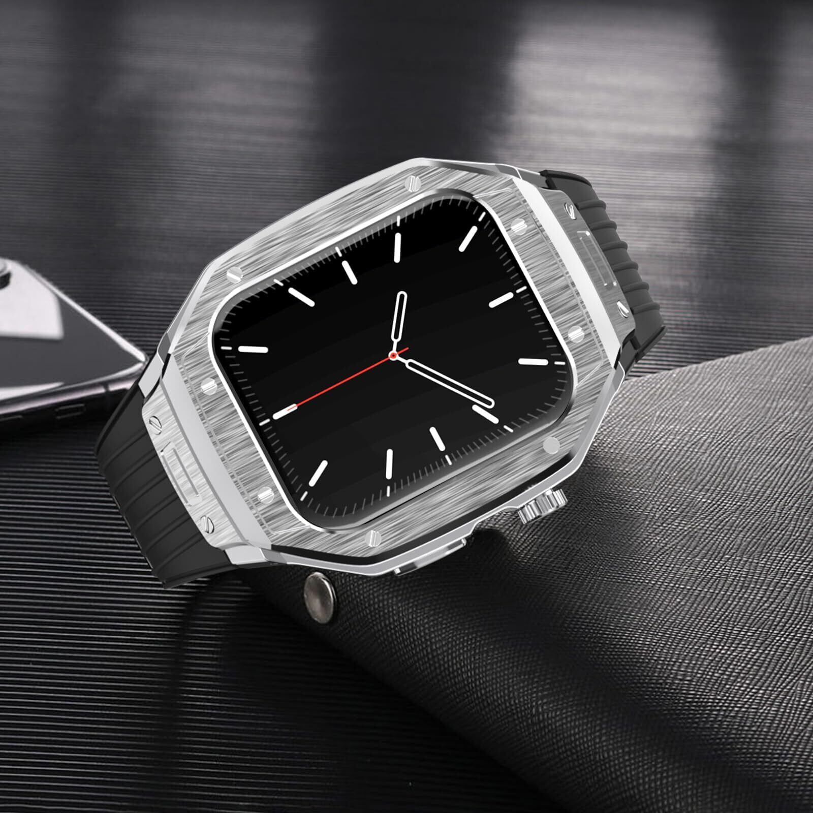 [YOFITAR] for Apple Watch バンドとケースと背面ケースの3in1一体型デザイン 45mm/44mm apple watch 一体型バンド Apple Watch Series 9/SE/8/7/6/5/4対応 メンズ かっこいい アップルウォッチ バンド カバー付き apple watch アクセサリー(45mm/44mm,シルバーケースとブラックベルト)