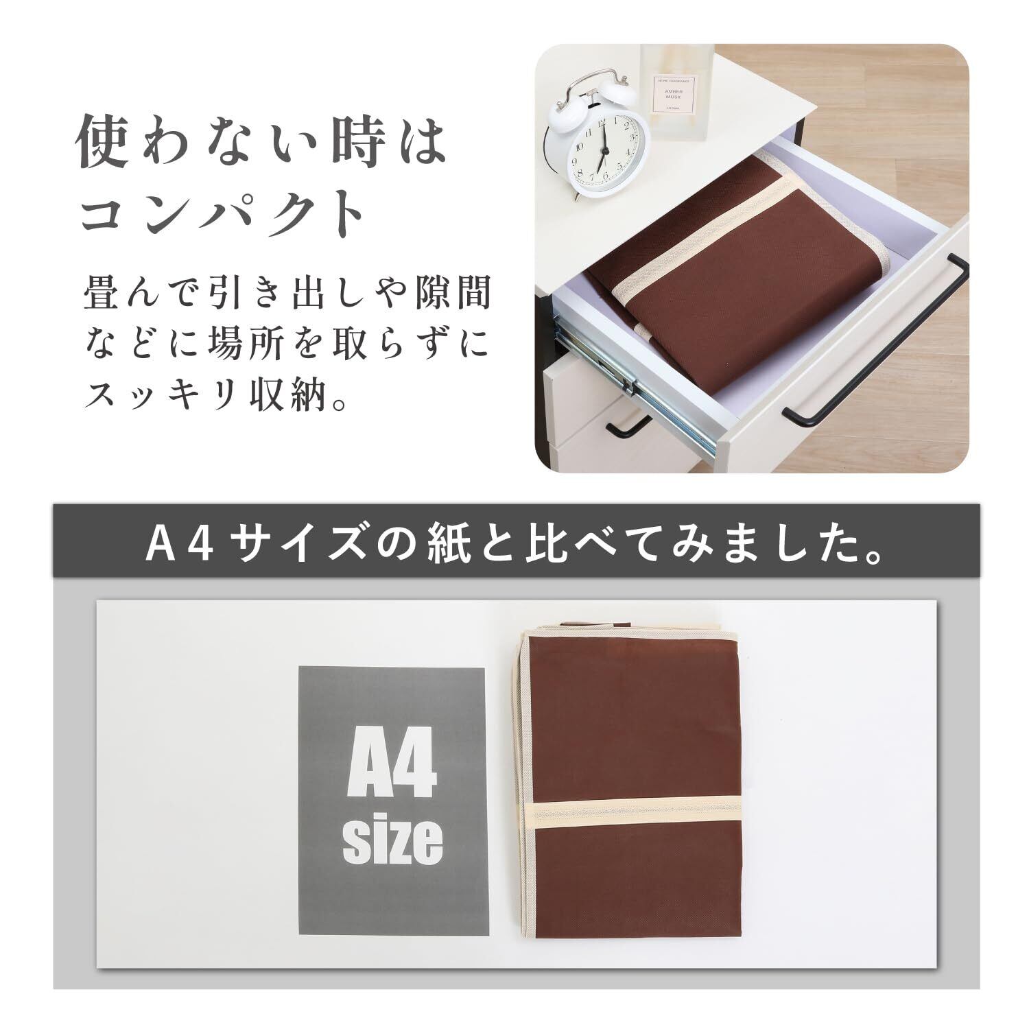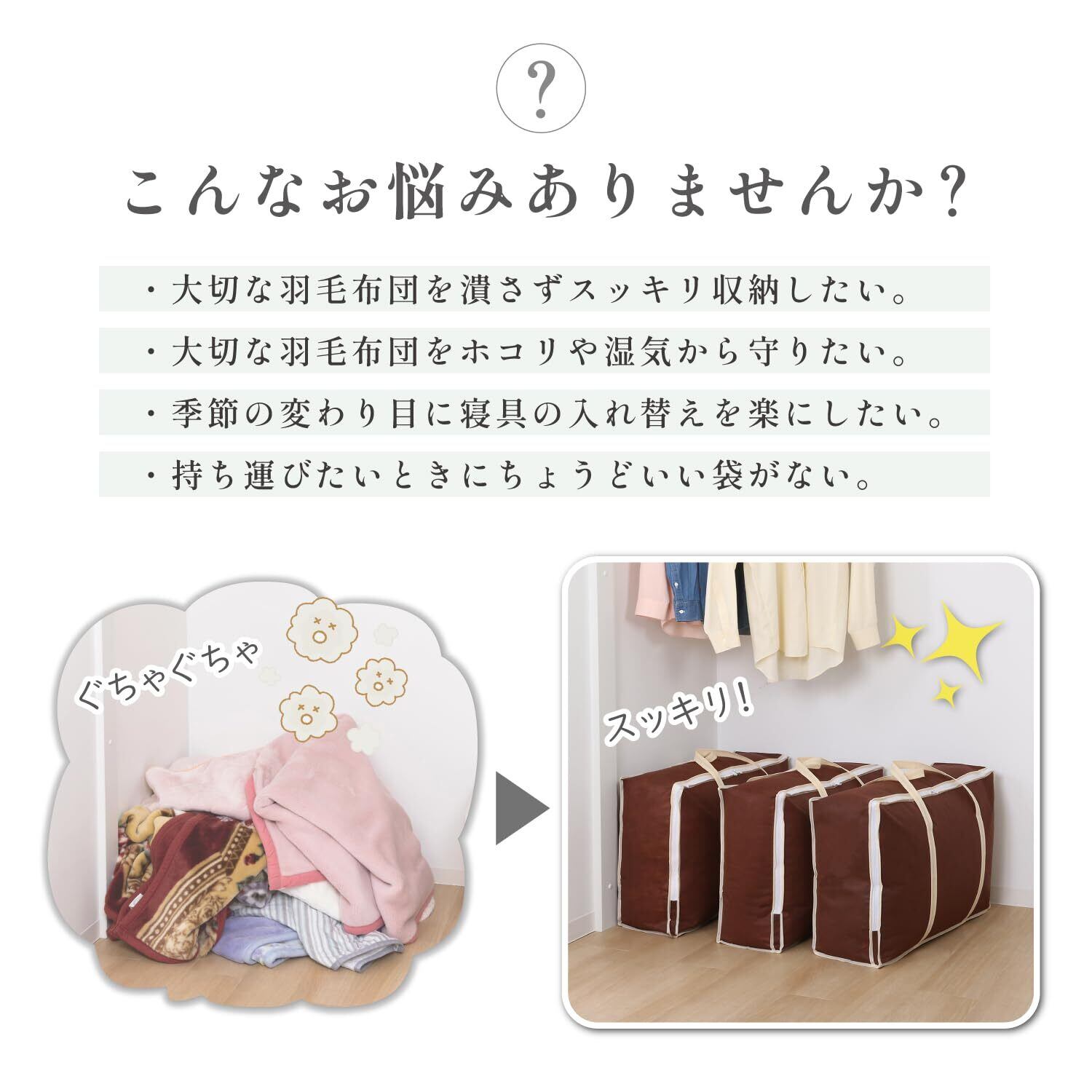 やさしく収納:かさばる羽毛布団をやさしくコンパクトに収納。圧縮しすぎないので、次にご使用する際も羽毛がへたらず、出してすぐにご使用いただけます。急な来客時にも安心です。