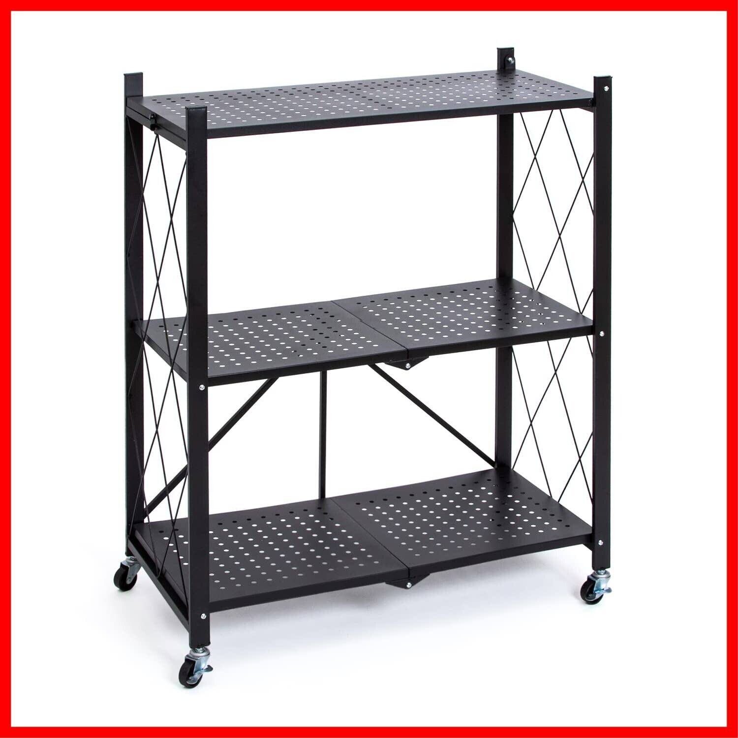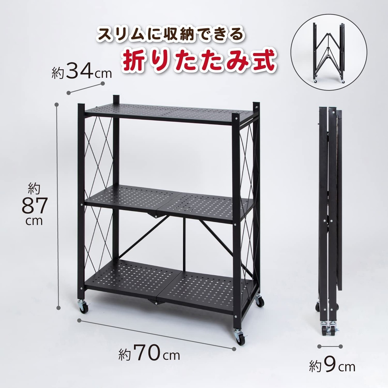 アストロ スチールラック 3段 ブラック 幅70×奥行34×高さ87cm 折りたたみ式 収納ラック シェルフ キャスター付き 731-13