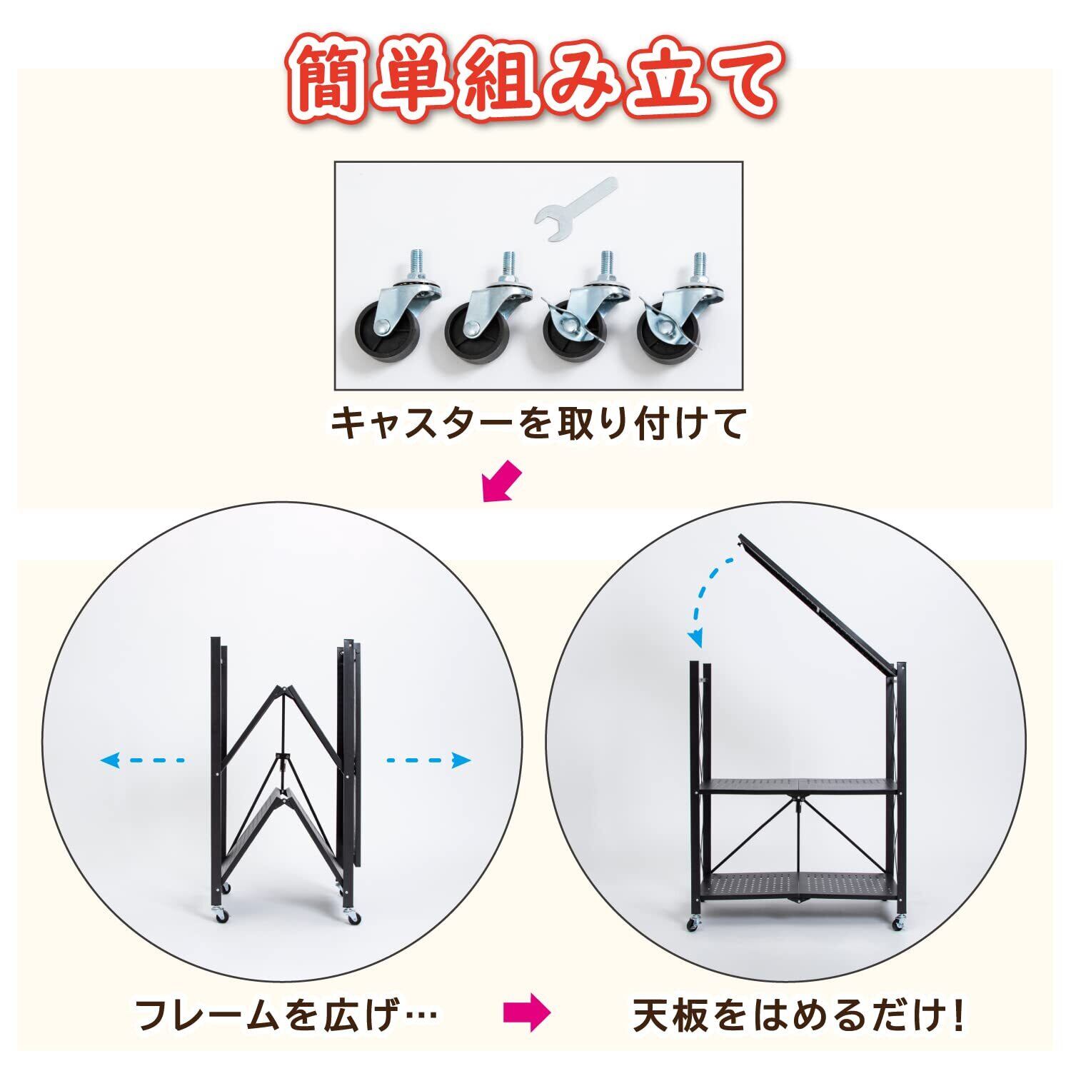 【届いてすぐに使える】:工具不要。折りたたみ式なので広げるだけで簡単に組み立てられます。