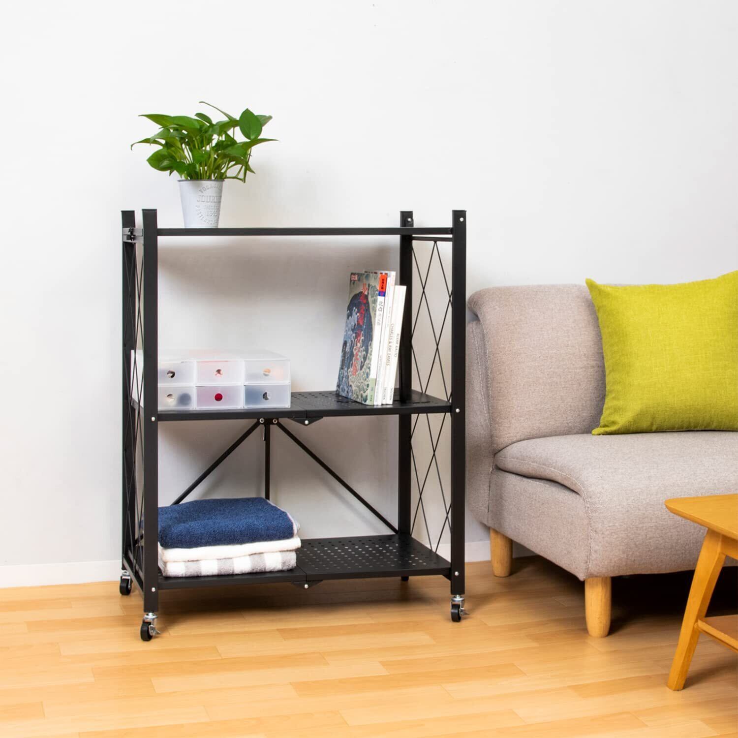 商品名:折りたたみラック 3段 黒カラー:ブラック本体サイズ(外寸):約幅70×奥行34×高さ87cm耐荷重:1段 各10kg材質:スチール内容:1台生産国:中国【特長】●届いてすぐに使える。工具不要。折りたたみ式なので広げるだけで簡単に組み立てられます。●折りたたみ式でたたむだけでスリム収納。使わない時にクローゼットへ収納したり、引っ越しの移動の際にも便利。●移動に便利なキャスター付き。●シンプルなデザインで、オフィスやキッチン、リビングや書斎など様々なお部屋で活躍します。【ご注意】●商品に同梱の注意事項をよくお読みいただき組み立て、お取り扱いください。●荷物を載せたままの移動はお控えください。【ASTRO CO., LTD】1970年創業、不織布収納日用品として「アストロ」のオリジナル商品を販売しています。生地の開発から製造、流通、品質管理を自社管理。収納用品をメインに多彩な日用品を企画販売してまいりました。アストロは暮らしを楽しく便利にさせる商品をこれからも創造し続けます。established in 1970