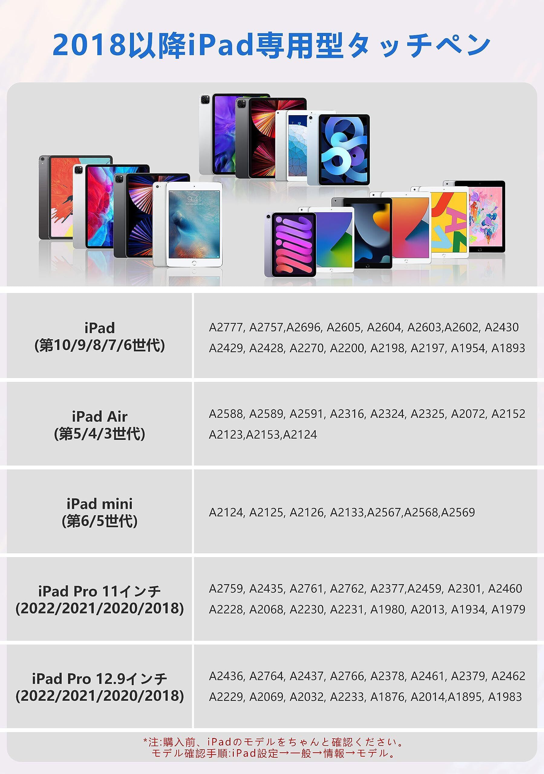 【2018年以降のiPad専用ペン】2018年から2025年のiPadモデルに対応しています。iPad Air 11インチおよび13インチ(M2) 2024/(M3) 2025、iPad Pro 11インチおよび13インチ(M4)、iPad 第11 世代 A16 2025、第10世代、iPad 9/8/7/6世代、iPad Mini 7 A17 Pro/6/5世代など、多くのiPadモデルと互換性があります。製品に関して何か問題があった場合は、お気軽にご連絡ください。お問い合わせ方法:アカウントサービスの「アカウントサービス」→「注文履歴」→「販売者」→「質問」からお気軽にお問い合わせください。