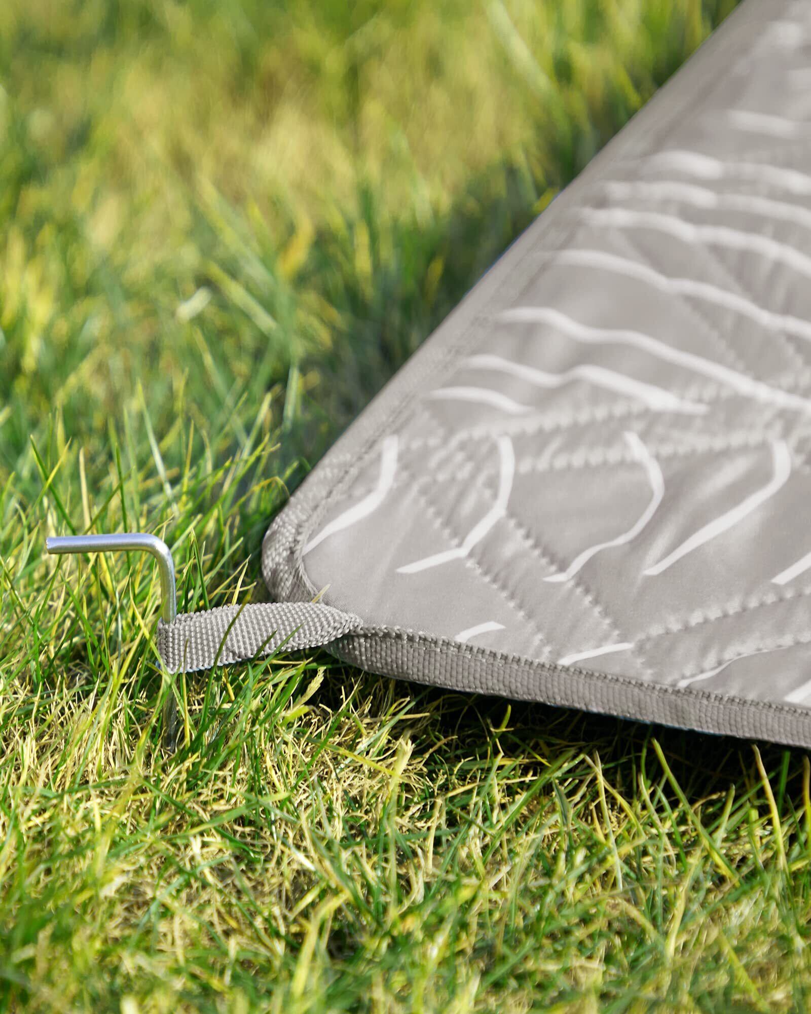 【優れる防水性能】底部はアルミ被覆なので保温性があって、地面からの湿気を遮断します。砂や土で汚れたら、洗濯機で丸洗いOK!簡単なお手入れで長い時間の使用にも耐えます。ペグ4本が付き、地面に固定できます