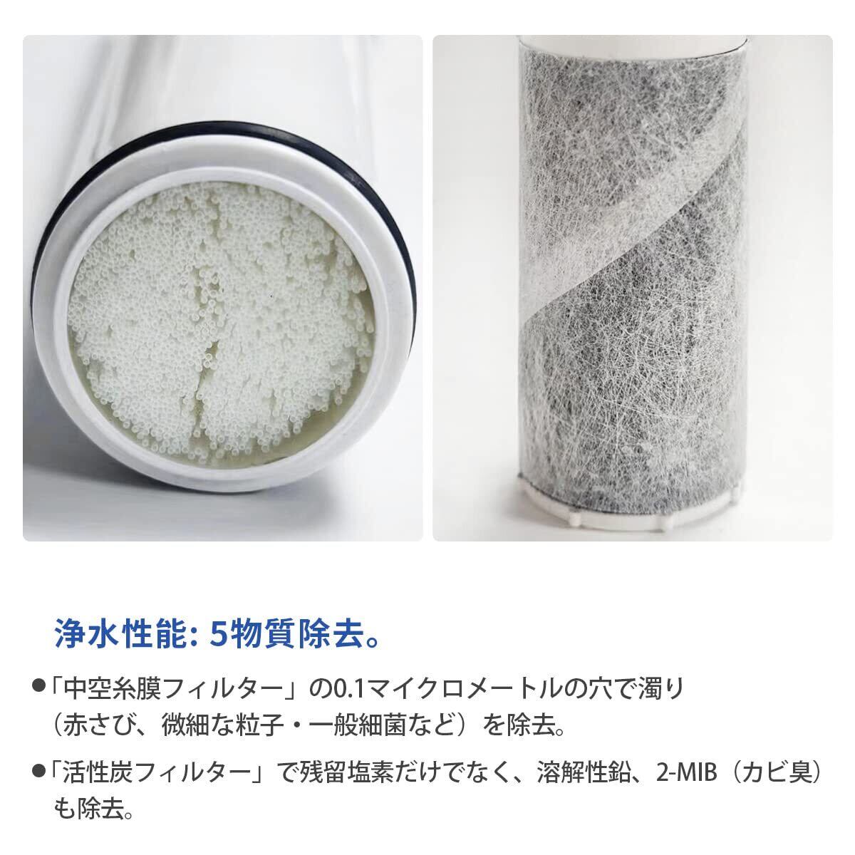 【5物質除去】遊離残留塩素、濁り、CAT、2-MIBカビ臭、溶解性鉛 【ろ材の種類】 中空糸膜、イオン交換繊維、活性炭、不織布 【サイズ】 直径30mm×長さ130mm