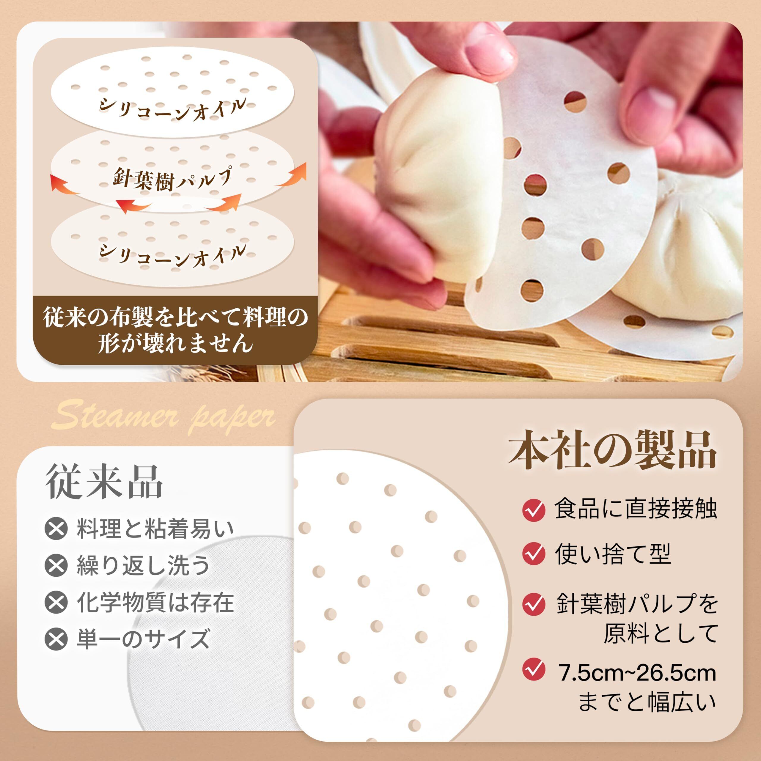 【粘着しにくい】素材は針葉樹パルプを原料とし、両面に食品用シリコーンオイルで作られています。これにより、食べ物がシートに粘着しにくく、蒸し器での使用時に簡単に取り外すことができます