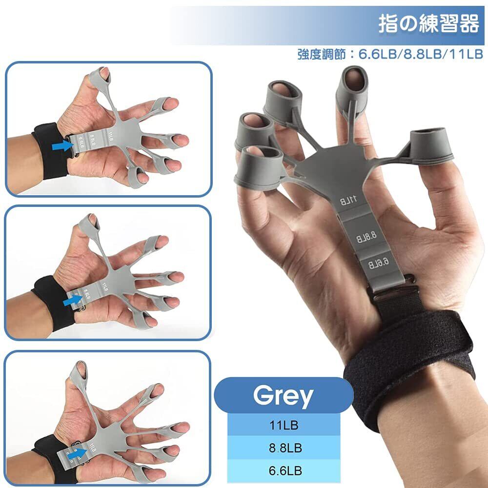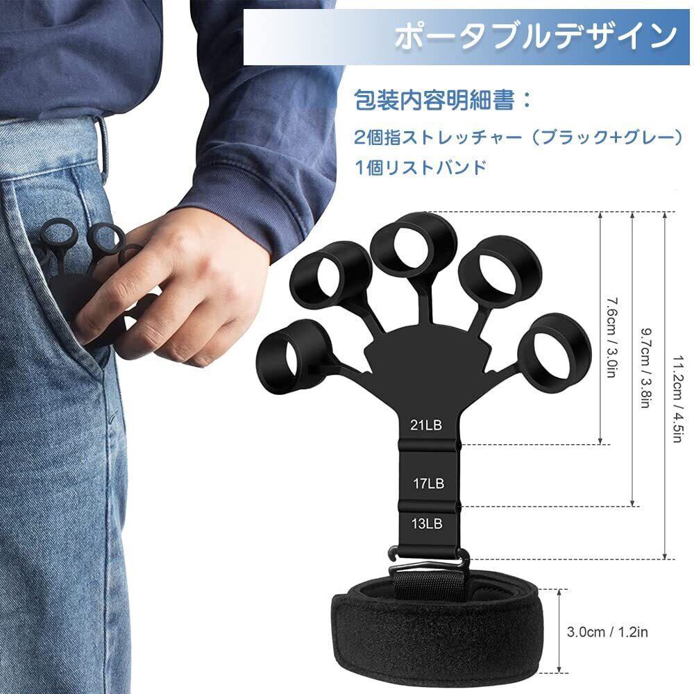 セット内容:2個指ストレッチャー(ブラック+グレー)、1個リストバンド 強度調節:13LB/17LB/21LB(ブラック) 、6.6LB/8.8LB/11LB(グレー) 商品サイズ:縦12cm×横11cm/穴径1.8cm/横高2.8cm
