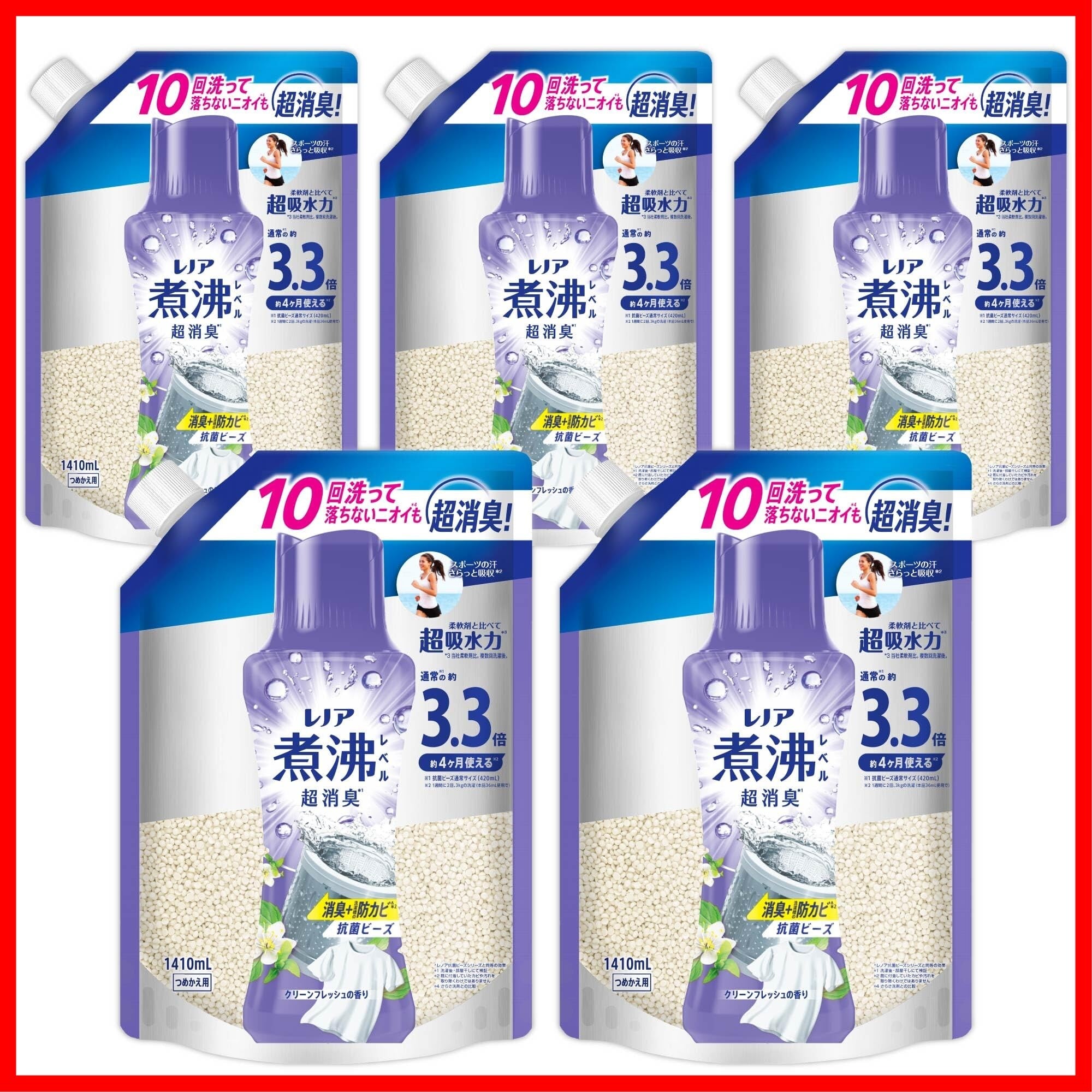 レノア 煮沸レベル消臭 抗菌ビーズ 消臭+防カビ クリーンフレッシュ 詰め替え 1,410mL×5袋 [大容量] [ケース品] 柔軟剤と一緒に使って効果長続き